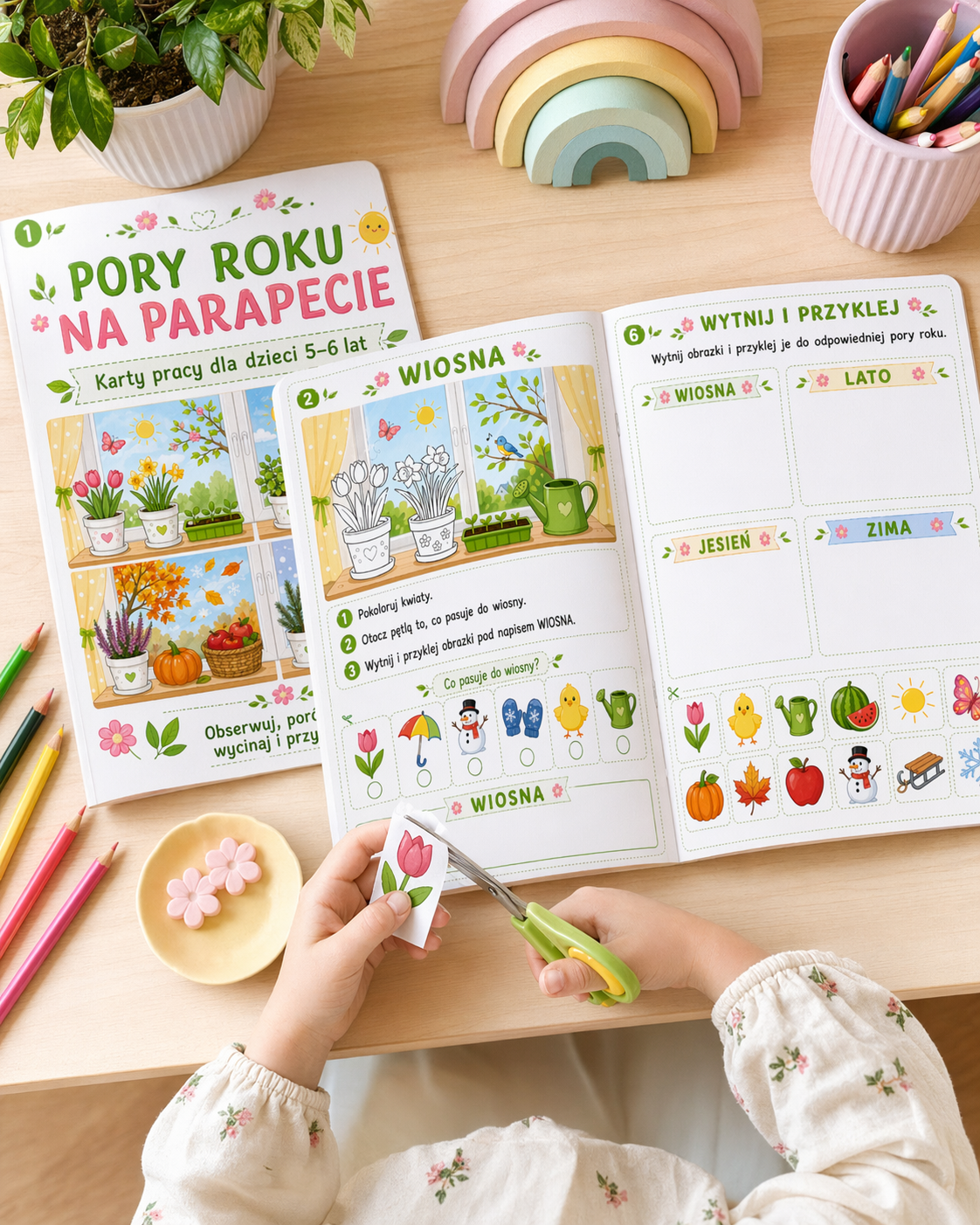 W środku znajdują się ilustracje parapetu w 4 porach roku, proste polecenia dostosowane do wieku przedszkolnego, a także zadania typu „wytnij i przyklej”. Dziecko rozpoznaje, co pasuje do danej pory roku, koloruje, wskazuje właściwe obrazki i utrwala wiedzę przyrodniczą przez zabawę 🌿🪴