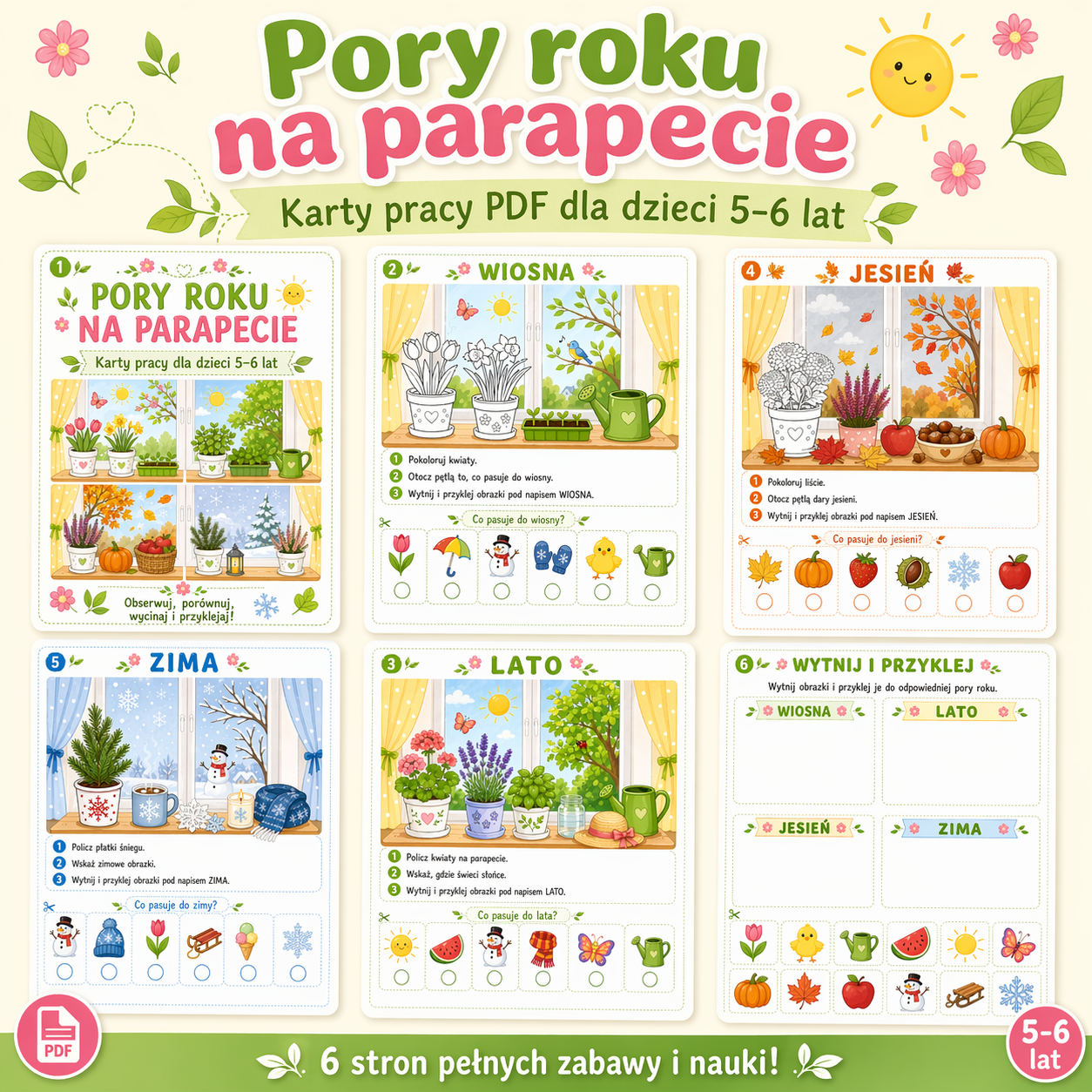 „Pory roku na parapecie” to uroczy, edukacyjny zestaw kart pracy dla dzieci w wieku 5–6 lat, który w prosty i atrakcyjny sposób wprowadza najmłodszych w temat pór roku 🌷☀️🍂❄️. Dzieci obserwują, jak wygląda parapet i przyroda za oknem wiosną, latem, jesienią i zimą, a przy okazji uczą się klasyfikowania, dopasowywania elementóworaz rozwijają spostrzegawczość i sprawność manualną ✂️🖍️