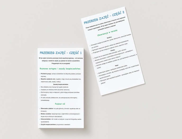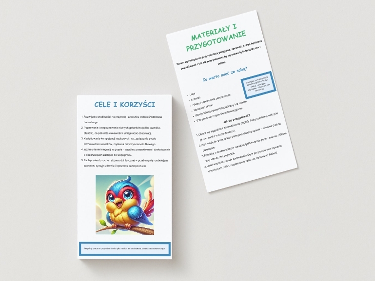 - Szczegółowy opis krok po kroku – od rozmowy wstępnej i ustalenia zasad, aż po metody obserwacji roślin, owadów i ptaków.
