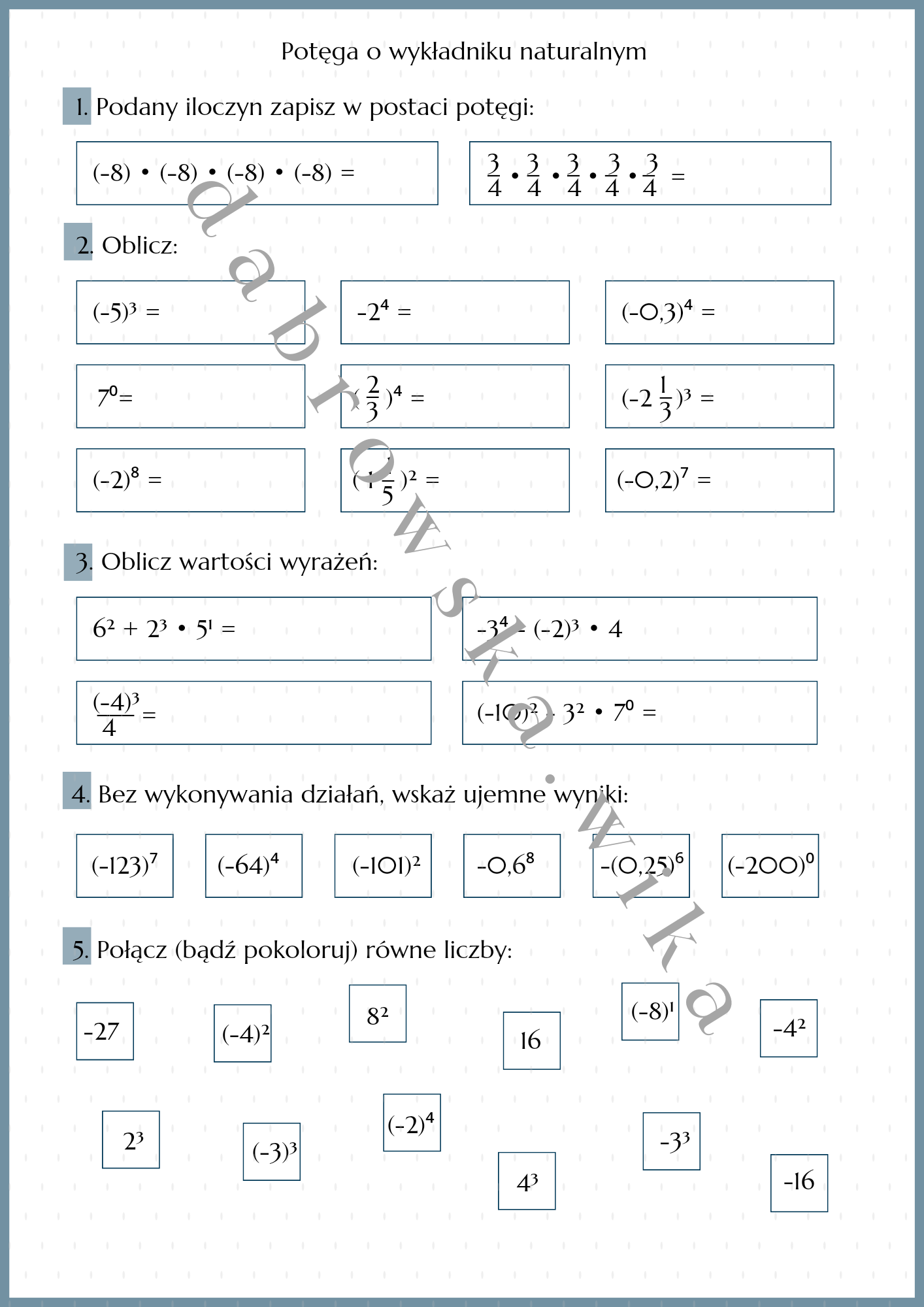 Materiał zawiera kartę pracy wprowadzającą w temat "potęgi o wykładniku naturalnym". Może również posłużyć jako kartkówka.