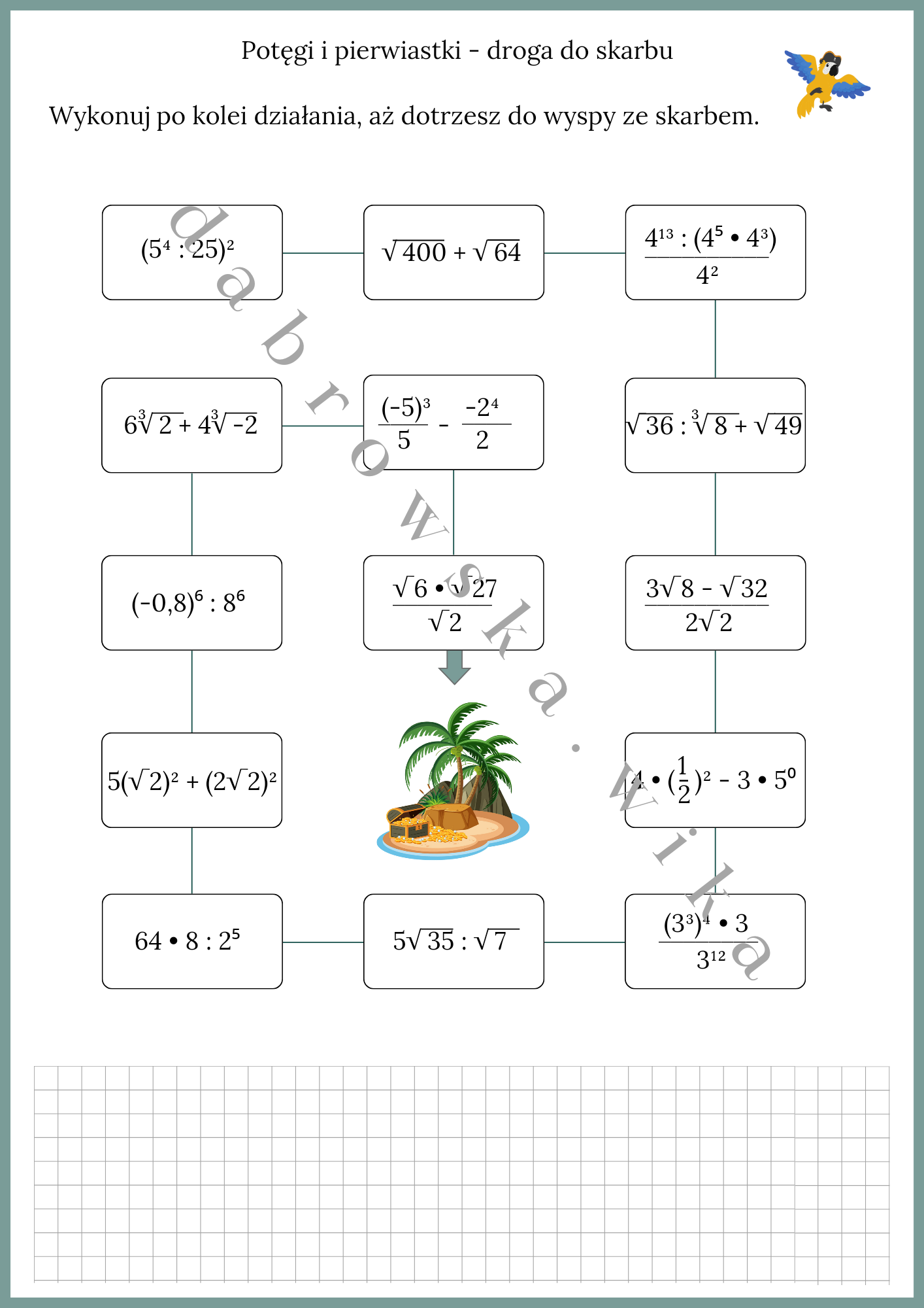 Karta pracy ma ciekawą formę — drogę na wyspę ze skarbem. Zadaniem ucznia jest wykonywanie po kolei działań, aż dotrze do wyspy.