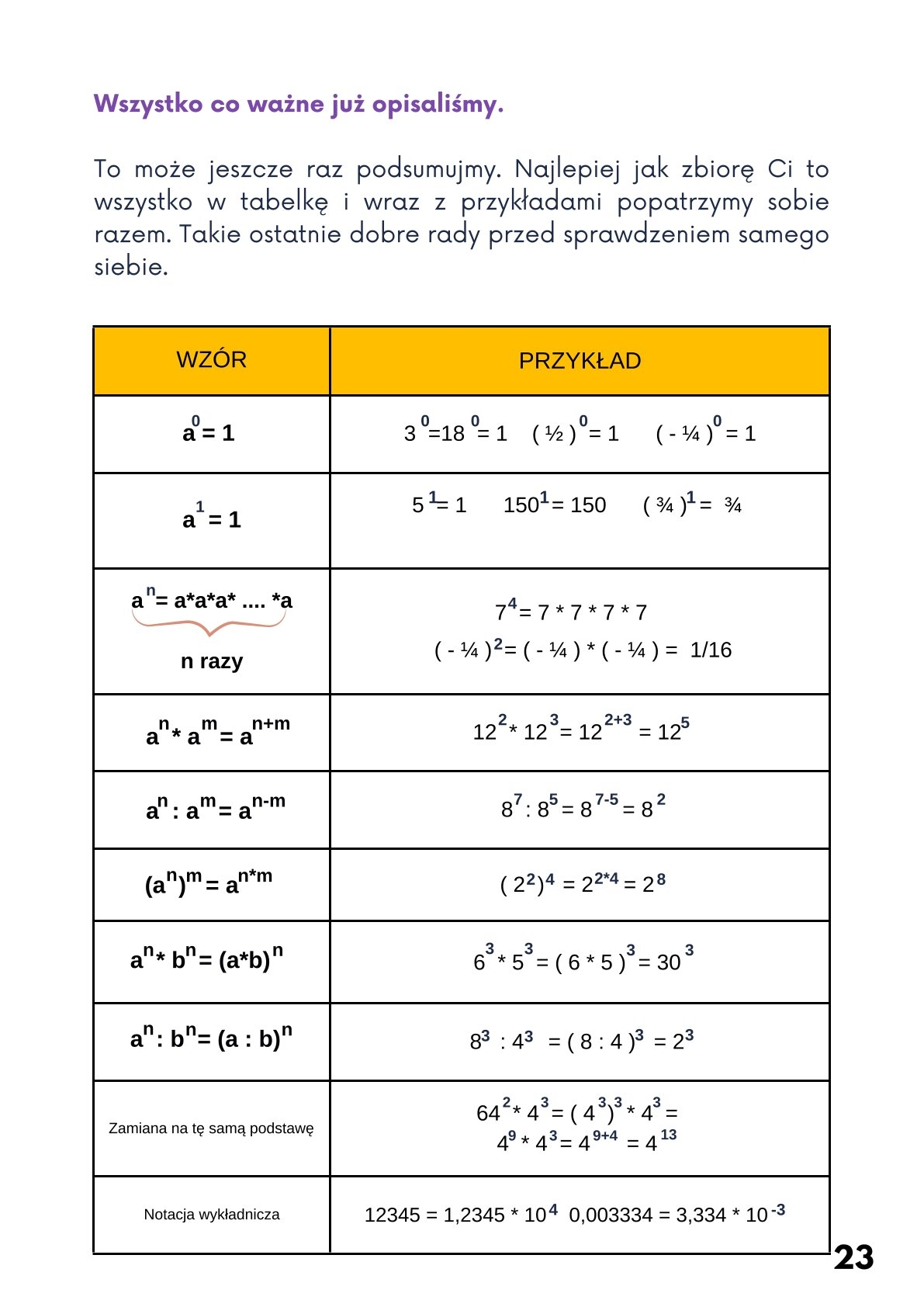 Rozwiązane przykłady od najprostszych po trudniejsze wykorzystujące działania na potęgach na liczbach całkowitych i ułamkach. Notacja wykładnicza.