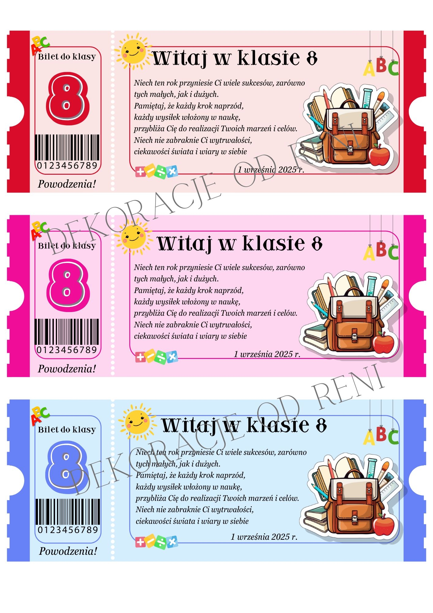 Powitalne Bilety do Klasy 8 to zestaw biletów w 6 kolorach (3 na A4).