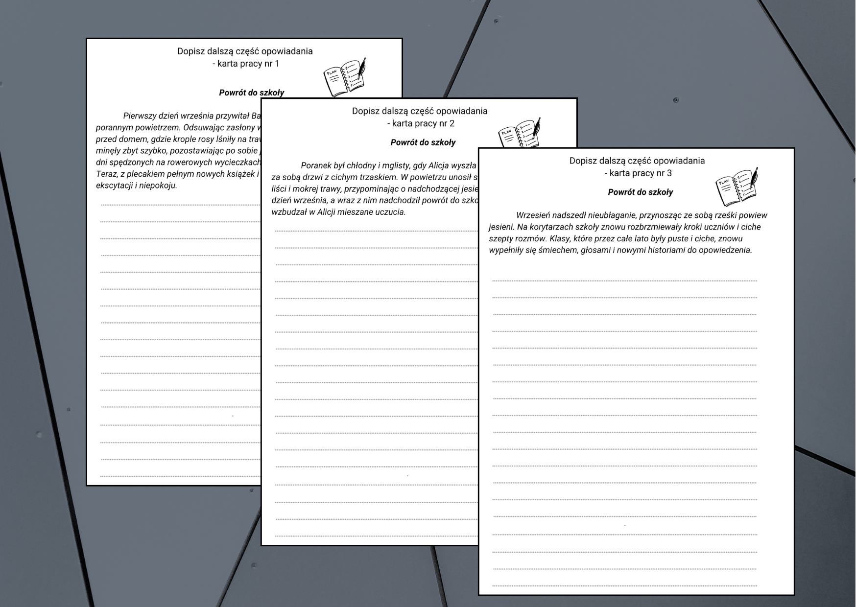Zestaw 3 kart pracy ze wstępami do opowiadań. Zadanie uczniów polega na dokończeniu tekstu.