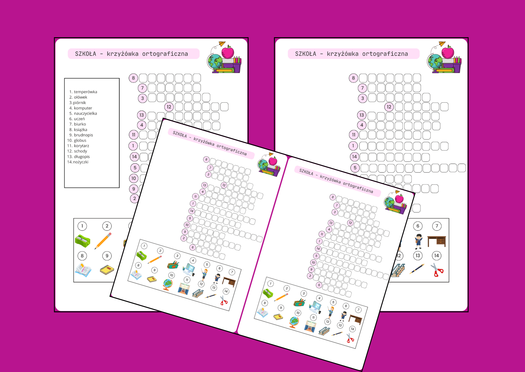 Krzyżówka obrazkowa dotycząca wyrazów związanych ze szkołą. Po rozwiązaniu wpisane słowa można wykorzystać np. do ćwiczeń ortograficznych lub redakcyjnych.