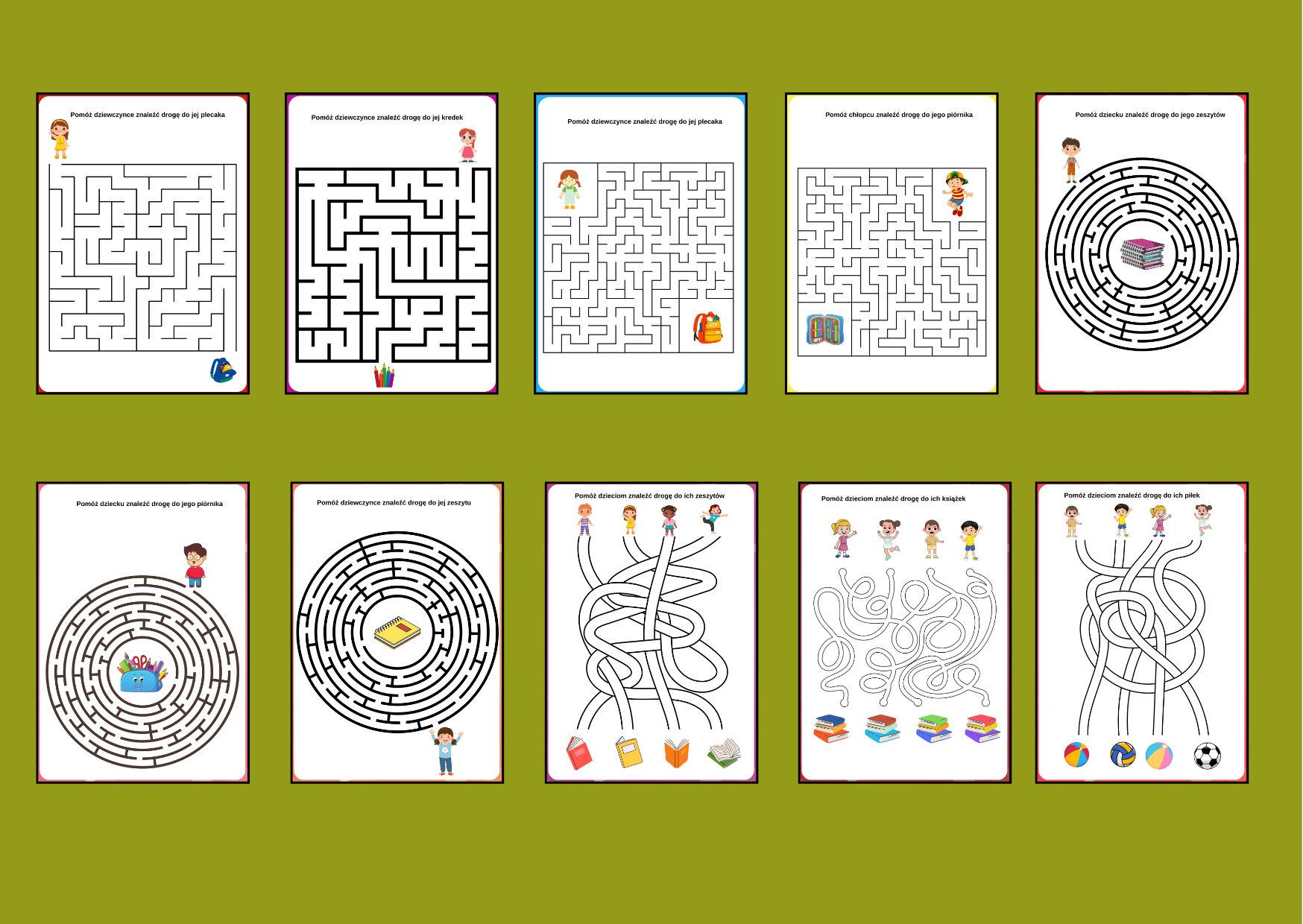 Zestaw labiryntów związanych ze szkołą. 10 wersji o różnym poziomie trudności, każdy w formacie A4 (można oczywiście zmniejszyć format podczas drukowania).