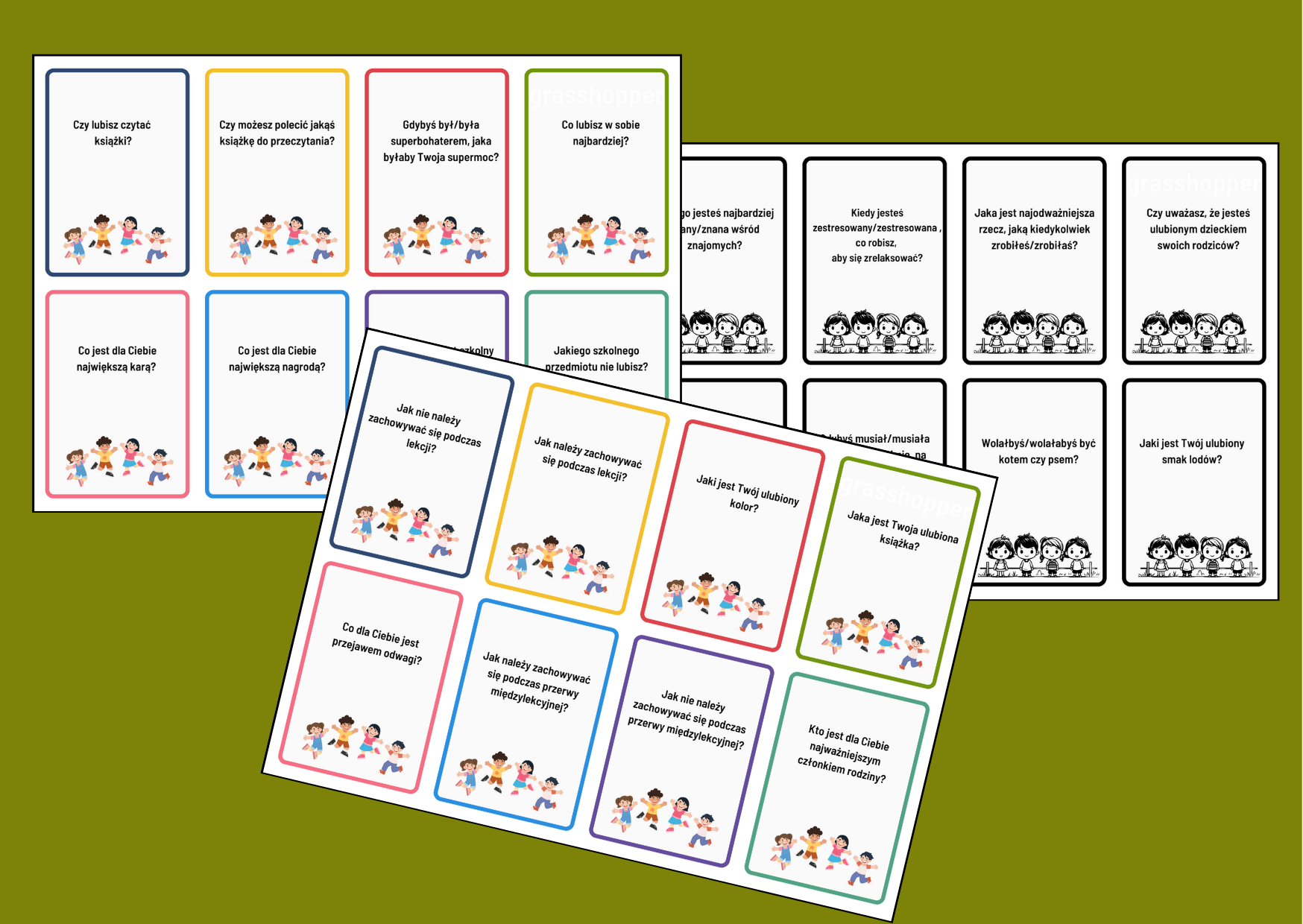 72 fiszki (9 stron pdf do wydruku w formacie A4) z pytaniami integracyjnymi, które świetnie sprawdzą się na pierwszych (i nie tylko) zajęciach z wychowawcą. Fiszki są w dwóch wersjach: kolorowej i czarno-białej.