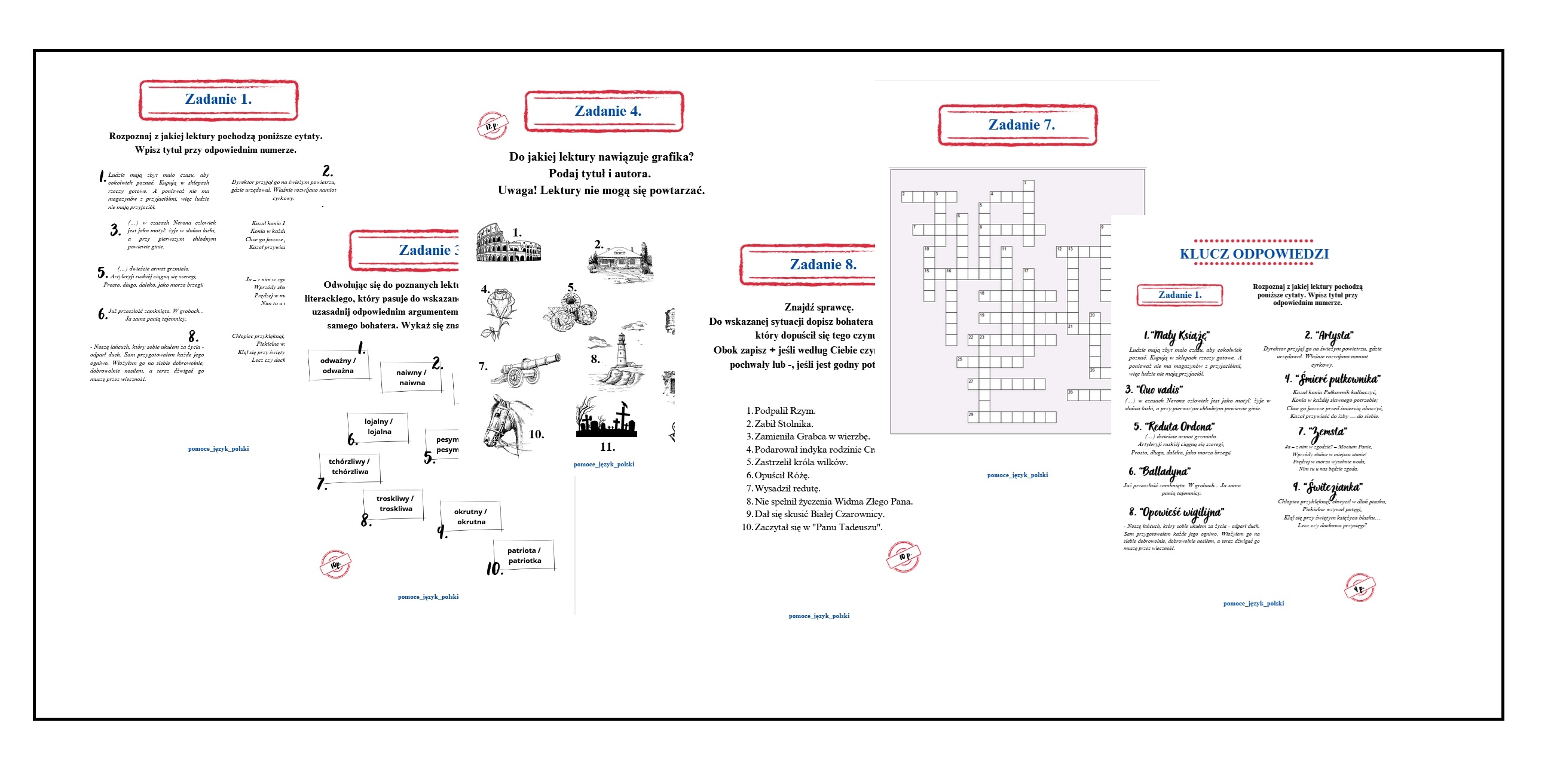 Dziesięć zadań, których celem jest przypomnienie omawianych w kl. 4 - 8 lektur oraz sprawdzenie w jakim stopniu uczniowie pamiętają ich treść.