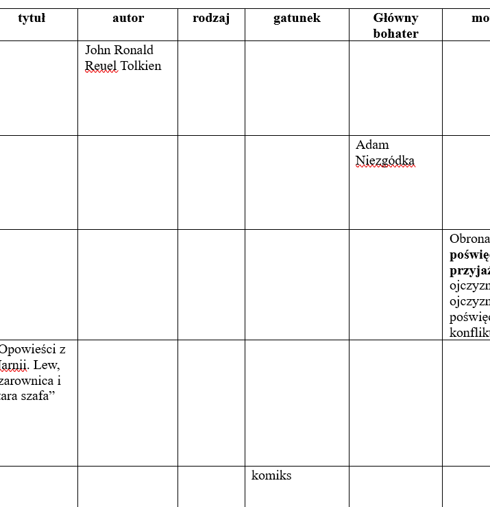 Powtórka z lektur obowiązkowych z klas 4-6 do egzaminu ósmoklasisty ("Hobbit", "Akademia Pana Kleksa", "Chłopcy z Placu Broni", "Kajko i Kokosz") w formie tabeli - tytuł, autor, rodzaj, gatunek, główny bohater, motywy + przykładowe odpowiedzi.