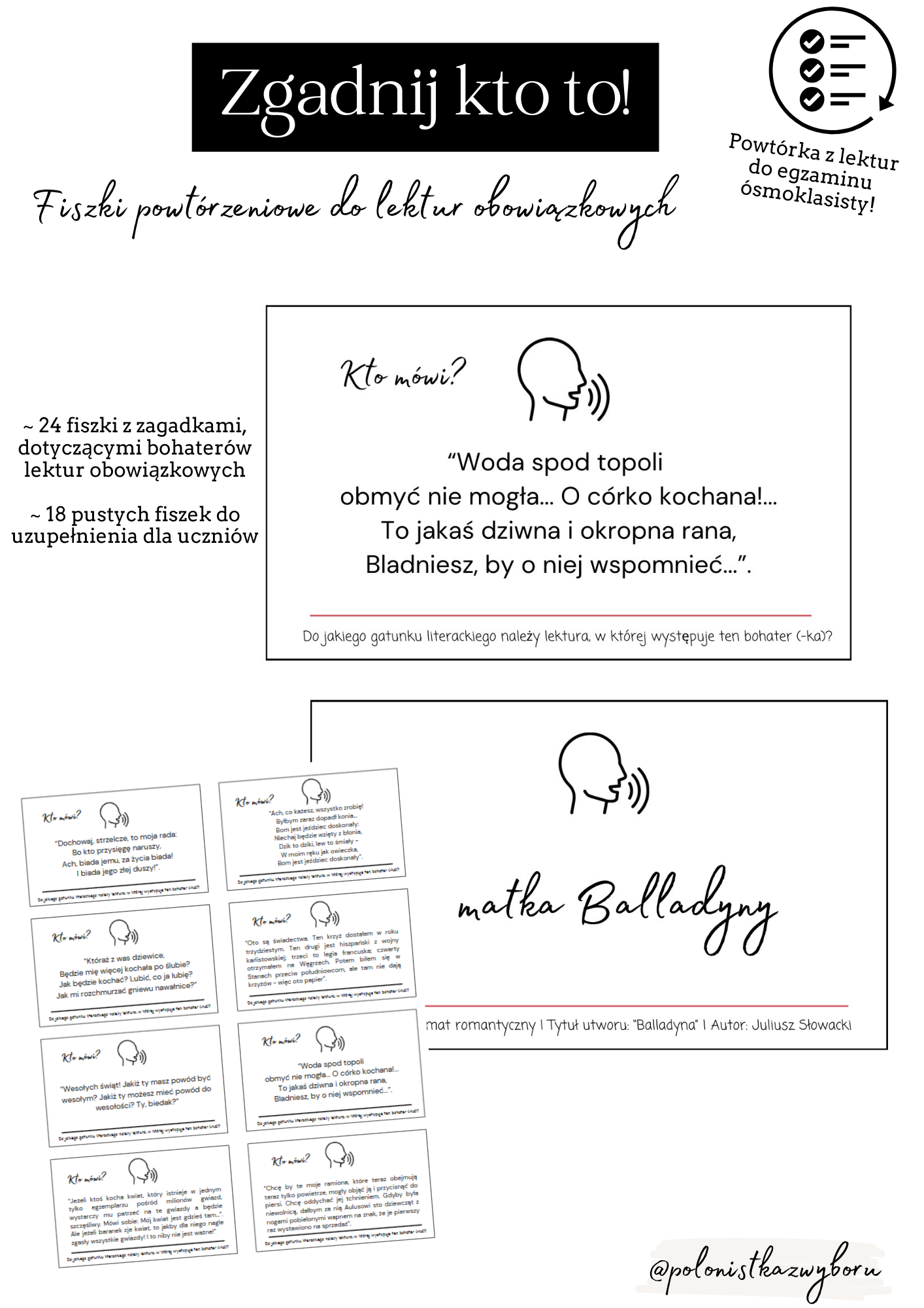 Materiał zawiera 24 fiszki dotyczące lektur obowiązkowych + 18 fiszek do wypełnienia przez uczniów. To nie tylko powtórka z lektur, ale również - gatunków literackich.
