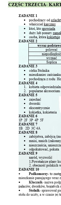 Zestaw składa się trzech części- w pierwszej proponuję 10 zadań pozwalających odświeżyć wiedzę, przejrzeć wybrane zagadnienia, ustalić, w jakim zakresie zostały one opanowane a co wymaga przypomnienia. Tę część zalecam wykorzystać podczas pracy wspólnej. Natomiast w części drugiej znalazło się 5 zadań odwołujących się do powtarzanych wcześniej treści. Ich forma inspirowana jest różnego typu zadaniami pojawiąjącymi się w arkuszach egzaminacyjnych. Ostatnią część stanowi karta odpowiedzi