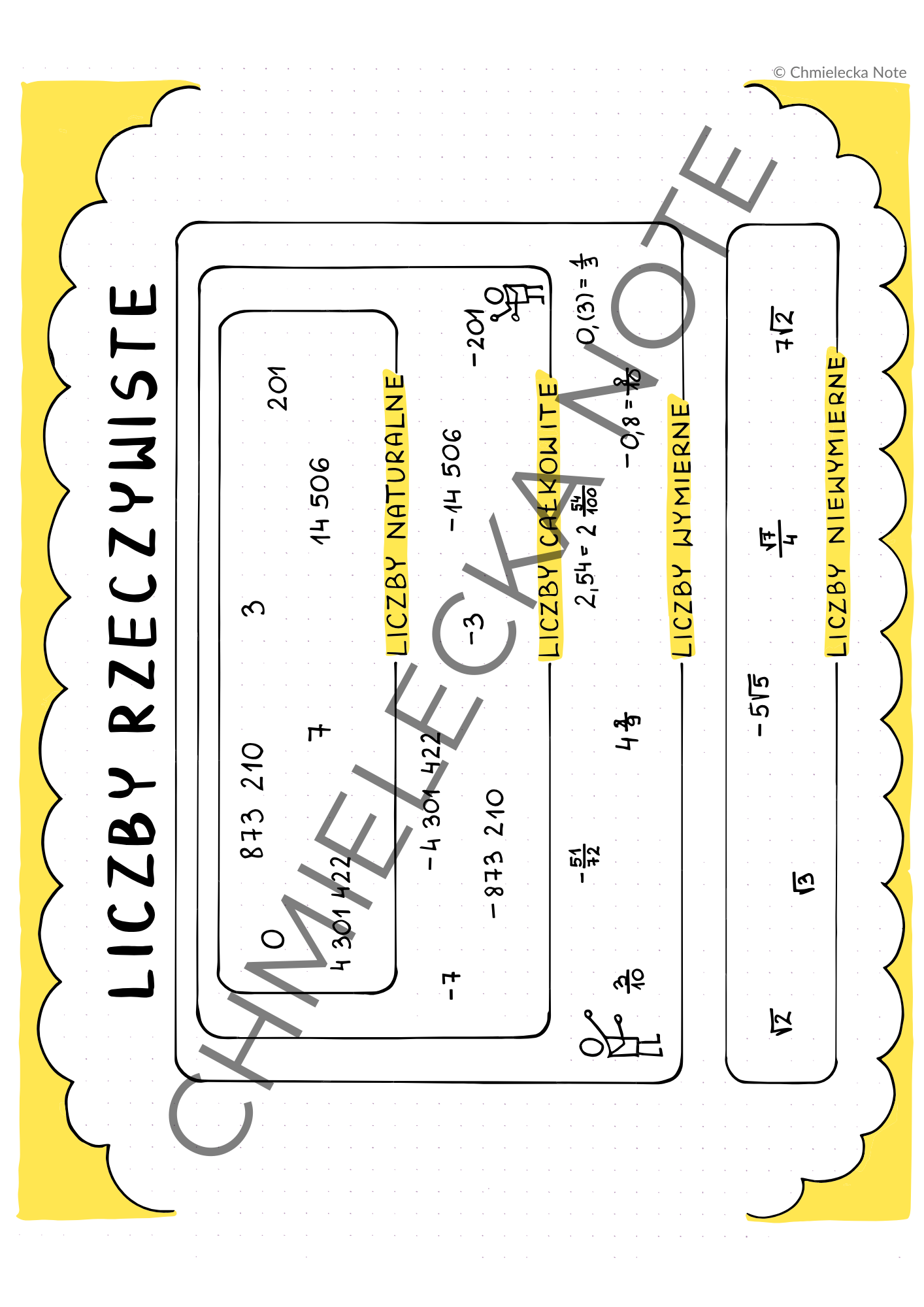 - 11 autorskich notatek wizualnych w lepszej jakości (zbiory liczbowe, liczby naturalne, działania pisemne na liczbach naturalnych, liczby całkowite i działania na liczbach całkowitych, ułamki zwykłe, działania na ułamkach zwykłych, ułamki dziesiętne, działania na ułamkach dziesiętnych, działania na liczbach wymiernych, potęgi, pierwiastki) dostępne w dwóch wersjach: czarno-białej i kolorowej. Notatki są całkowicie ręcznie rysowane, więc wszelkie niedoskonałości są ich elementem;;