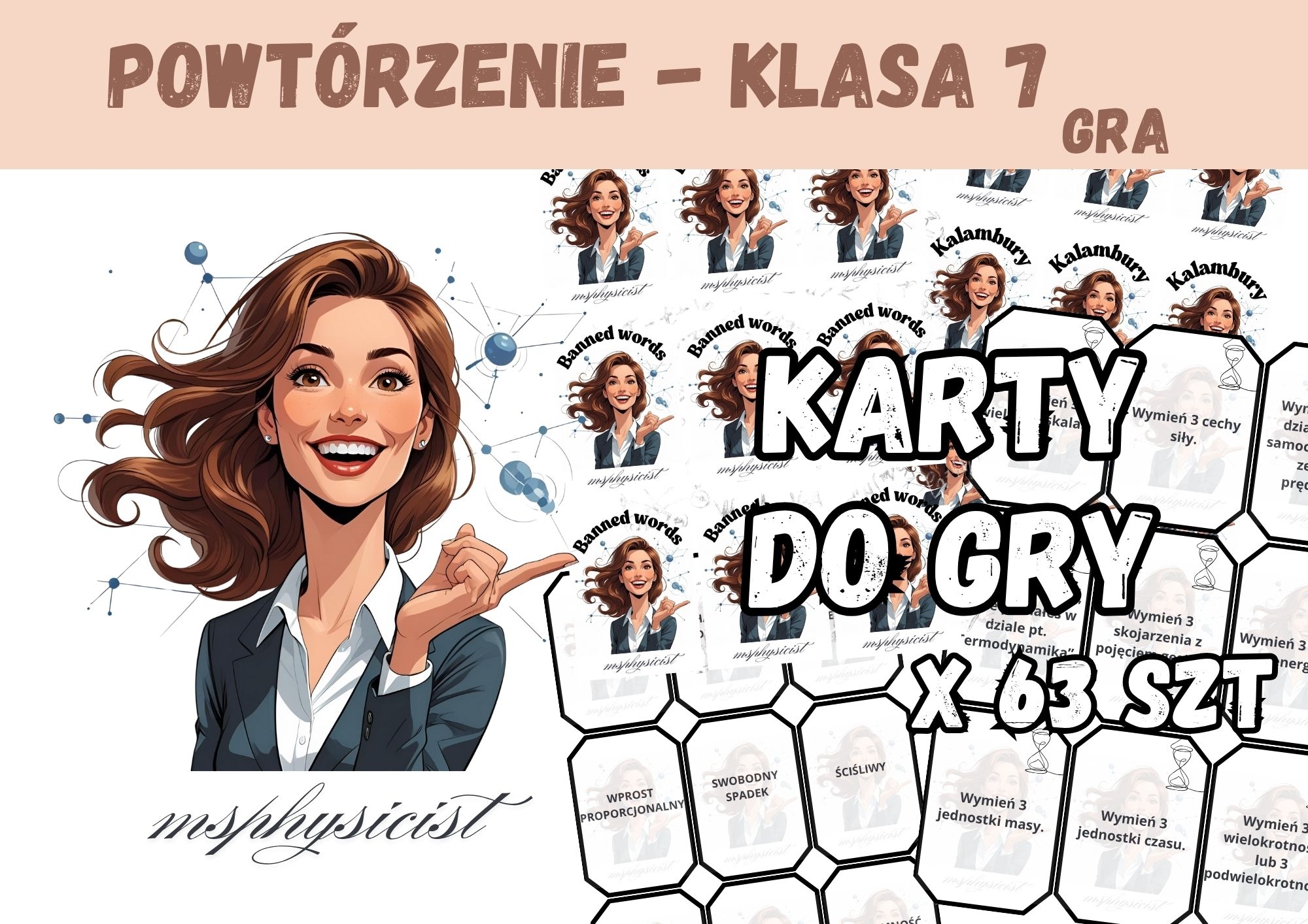 Kupując materiał otrzymujesz: 63 estetycznie zaprojektowanych kart gry, które nawiązują do treści z podstawy programowej dla klasy 7 (18 kart - szybka odpowiedź, 18 kart - zakazane słowa, 27 kart - kalambury),