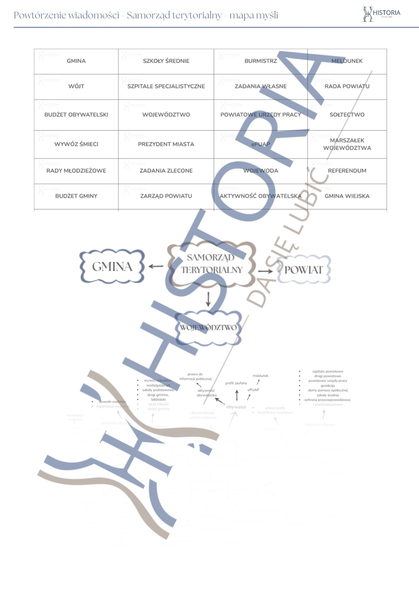 Losowanie haseł + podręcznik = mapa myśli. Tyle wystarczy, aby powtórzyć i utrwalić cały dział o samorządzie terytorialnym.