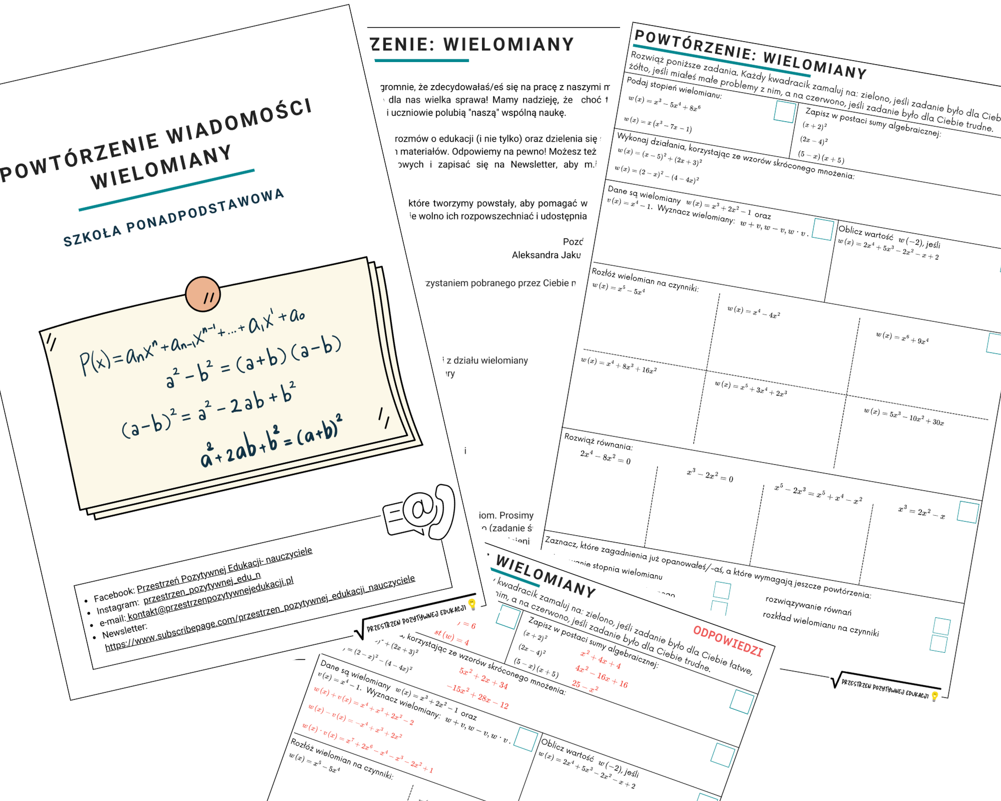 Powtórzenie wiadomości z wielomianów zawiera zadania z działań na wielomianach (dodawanie, odejmowanie, mnożenie), obliczanie wartości wielomianu, rozwiązywanie równań wielomianowych, rozkład wielomianu na czynniki. Uczniowie po wykonaniu zadania zamalowują kwadracik przy każdym zadaniu na zielono (zadanie łatwe), żółto (zadanie średnio-trudne) lub czerwono (zadanie trudne). Następnie zaznaczają, które treści i umiejętności już opanowali, a które wymagają utrwalenia.