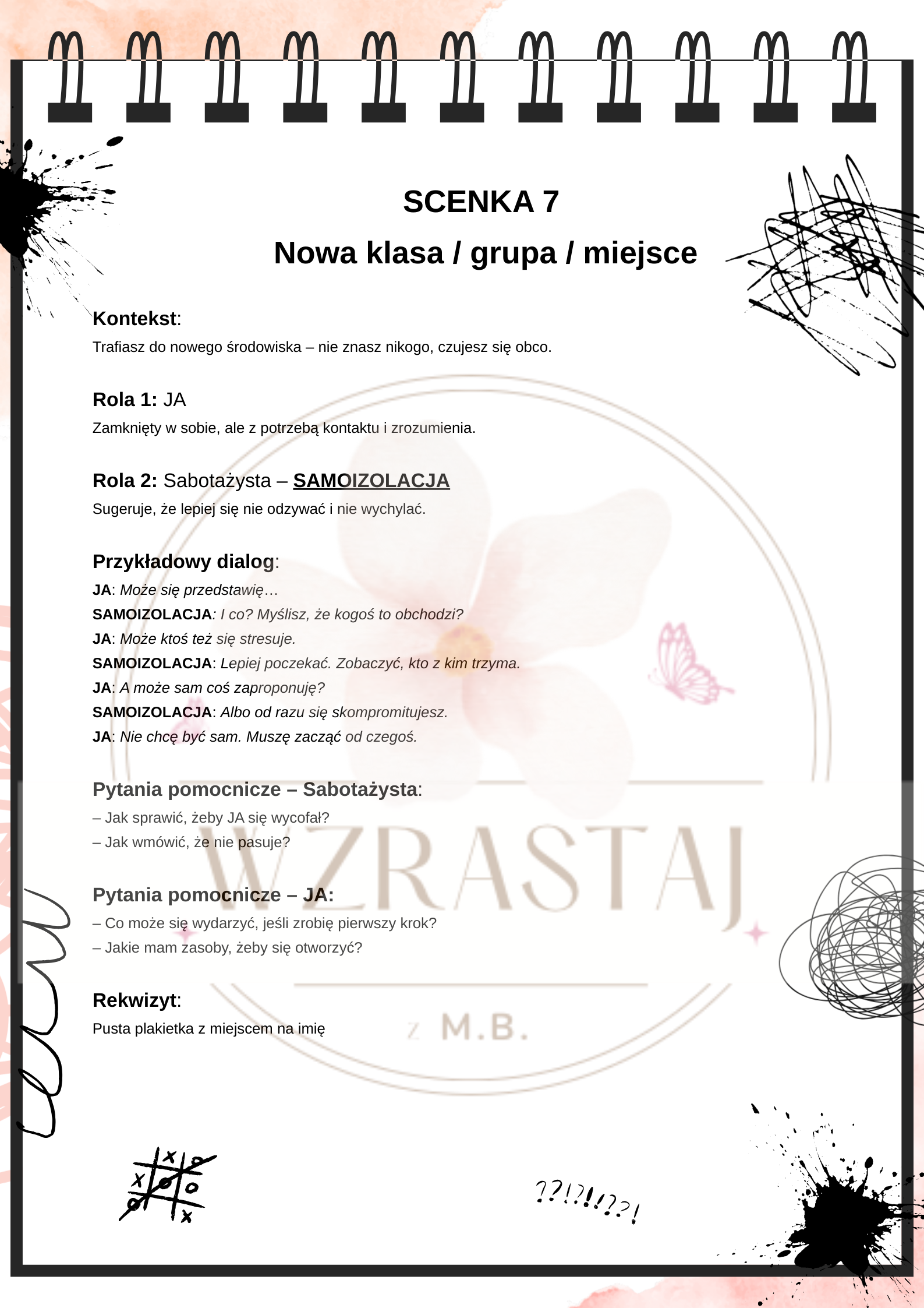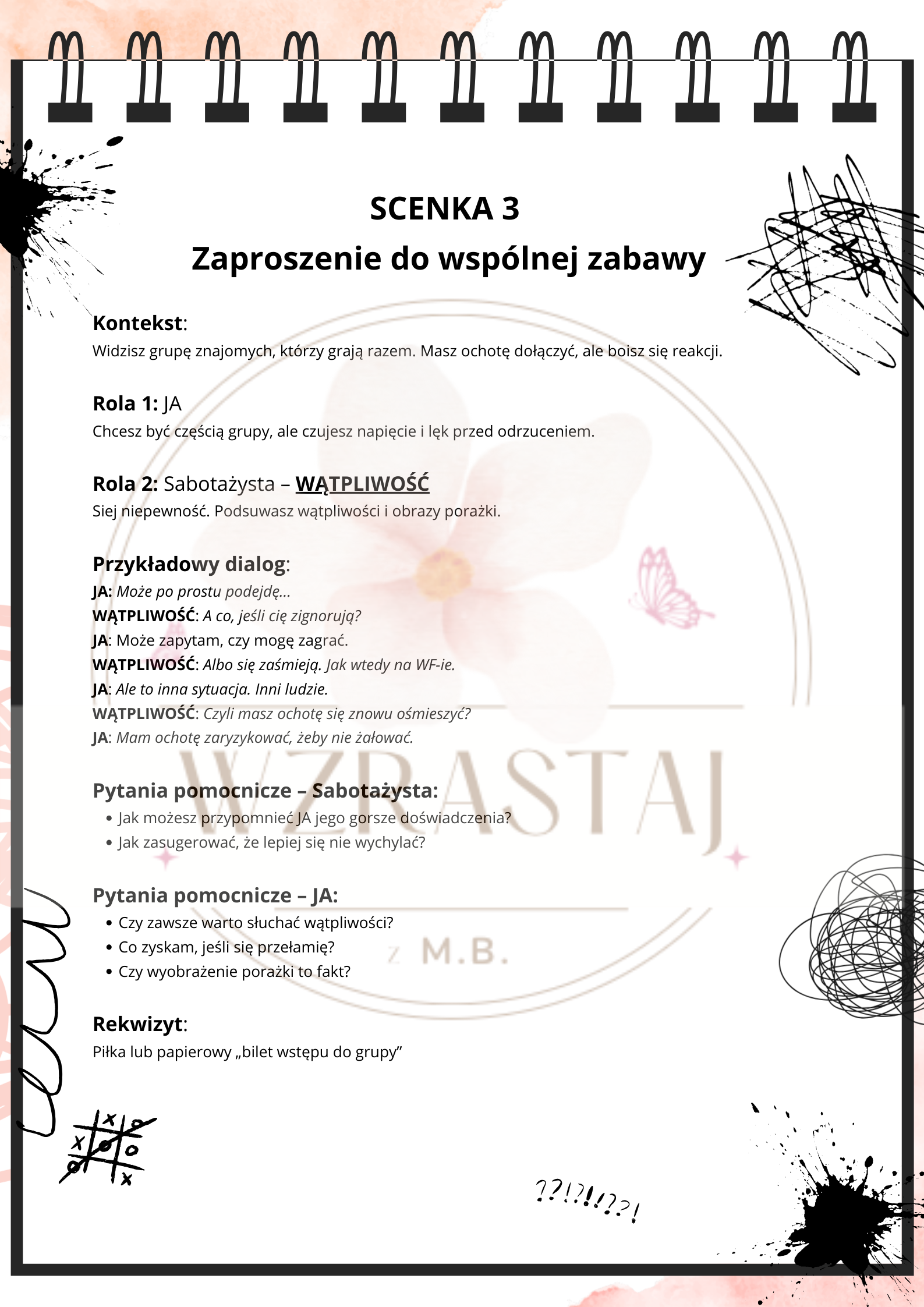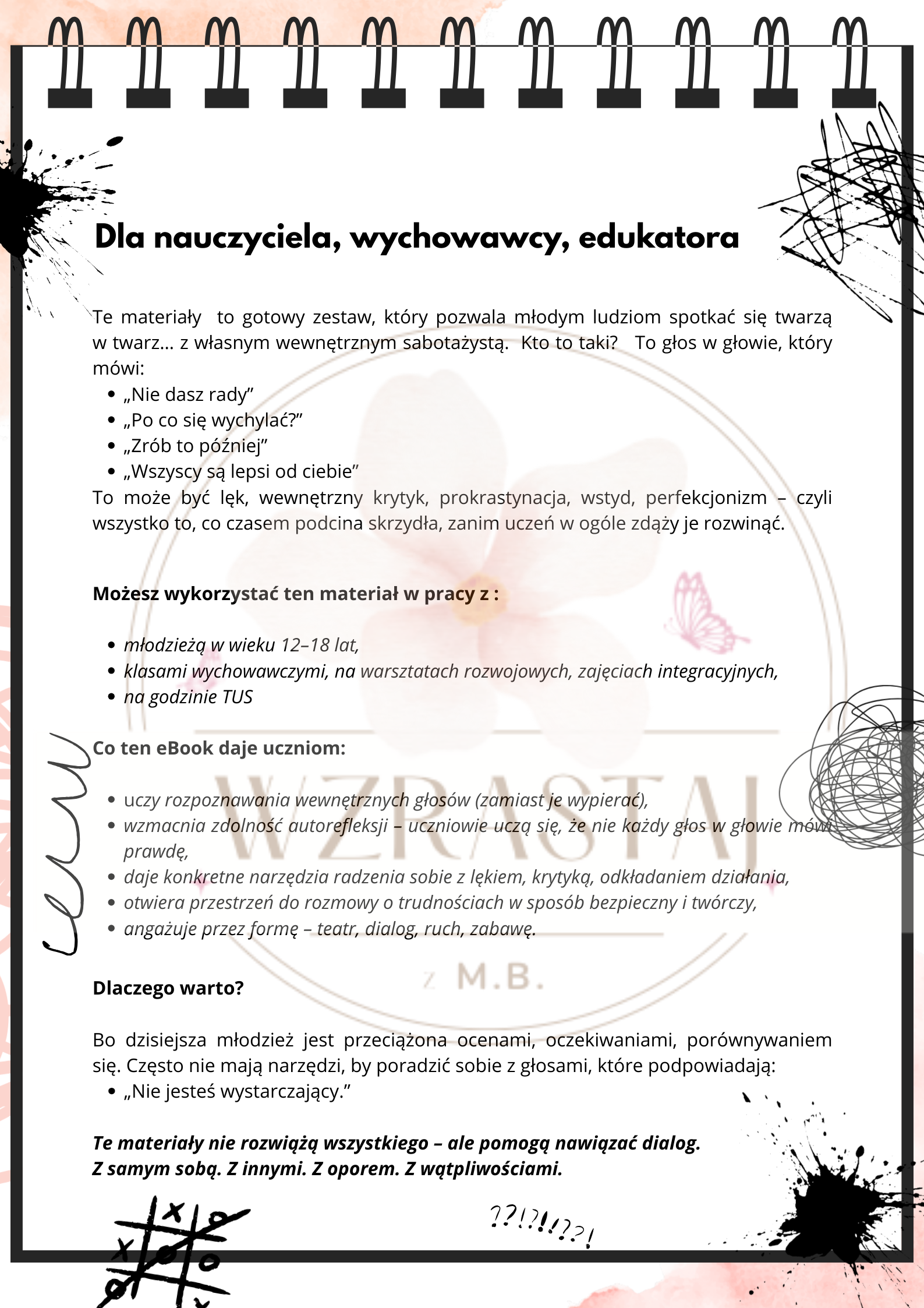 Rozmowy z sabotażystą” to gotowy materiał do przeprowadzenia dwóch angażujących lekcji z uczniami od 4 klasy wzwyż. Pomaga zrozumieć, czym są wewnętrzne, sabotujące myśli - takie jak głos lęku, perfekcjonizmu czy zniechęcenia.