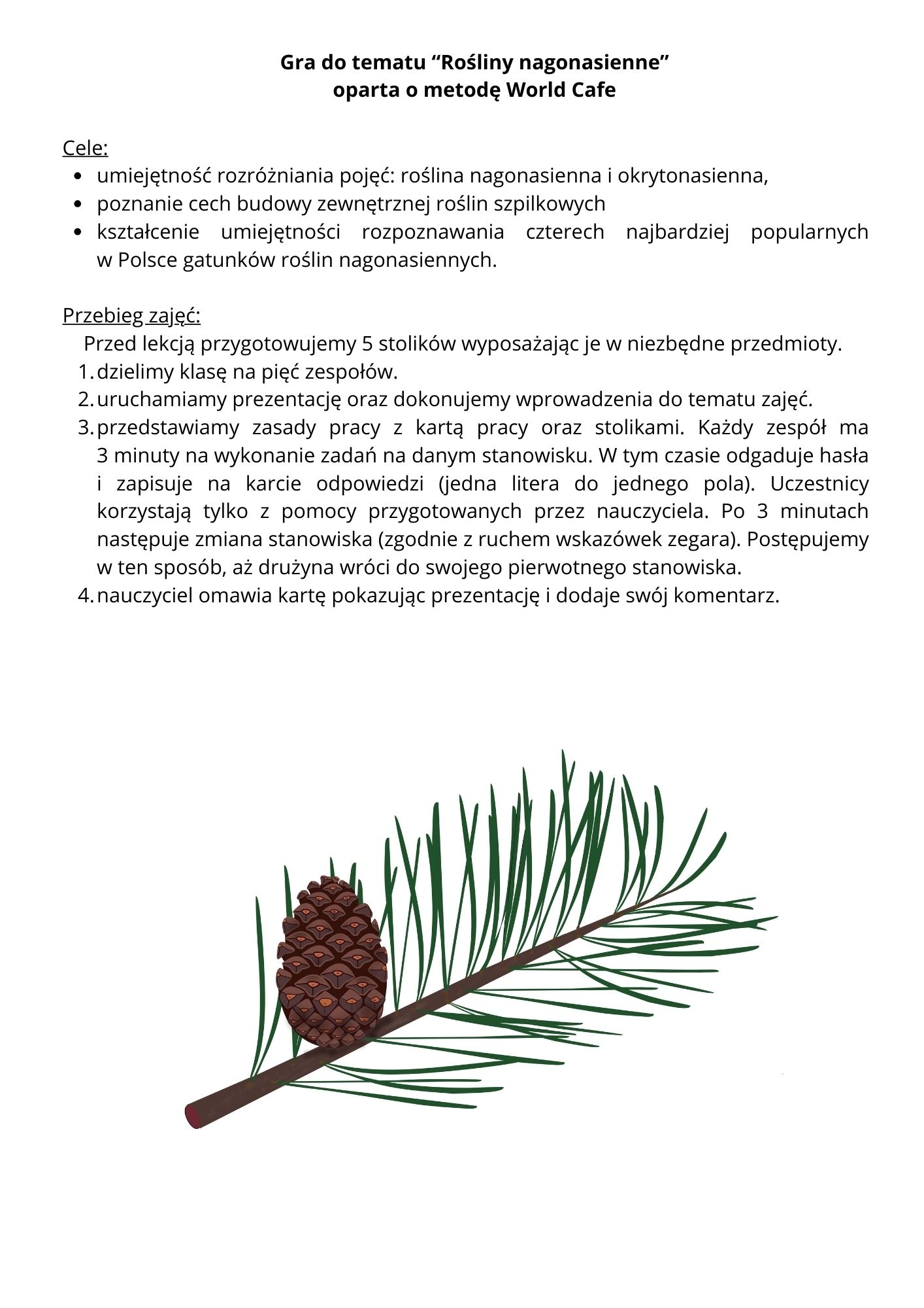 Materiał skierowany do pracy w klasie, przy podziale na grupy 4-5-osobowe. Materiał porusza podstawowe zagadnienia takie jak: budowa rośliny nagonasiennej, funkcja wybranych elementów jej budowy, umiejętność rozróżniania czterech nagonasiennych w Polsce (sosna, świerk, jodła, modrzew), znaczenie w przyrodzie oraz dla człowieka. Do lekcji można dodać wybrane elementy, które również wskazano w opisie do lekcji. W prezentacji zawarto te same ilustracje, które widnieją w zadaniach stolikowych oraz odpowiedzi. W ramach materiału przygotowano zadania na pięć stanowisk/stolików.