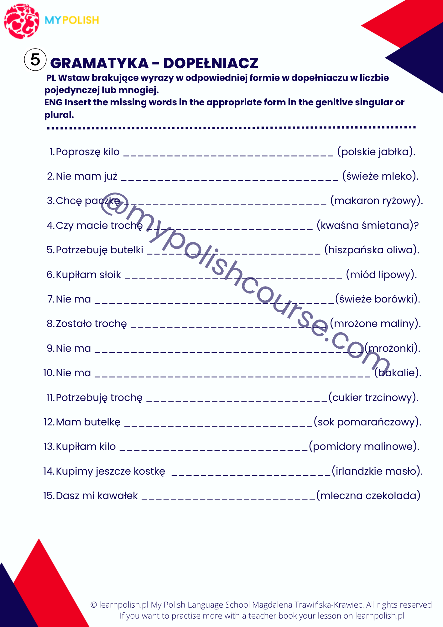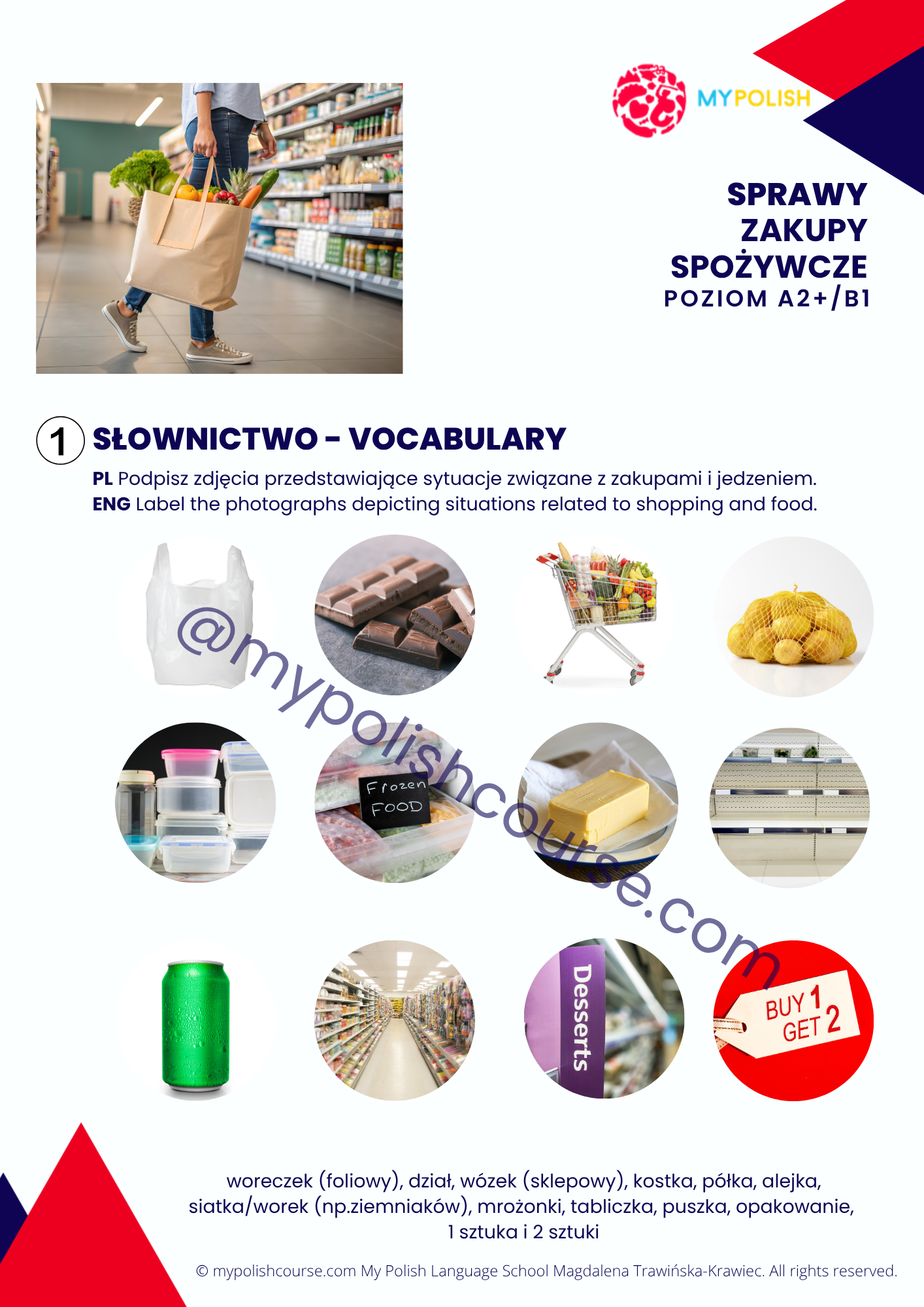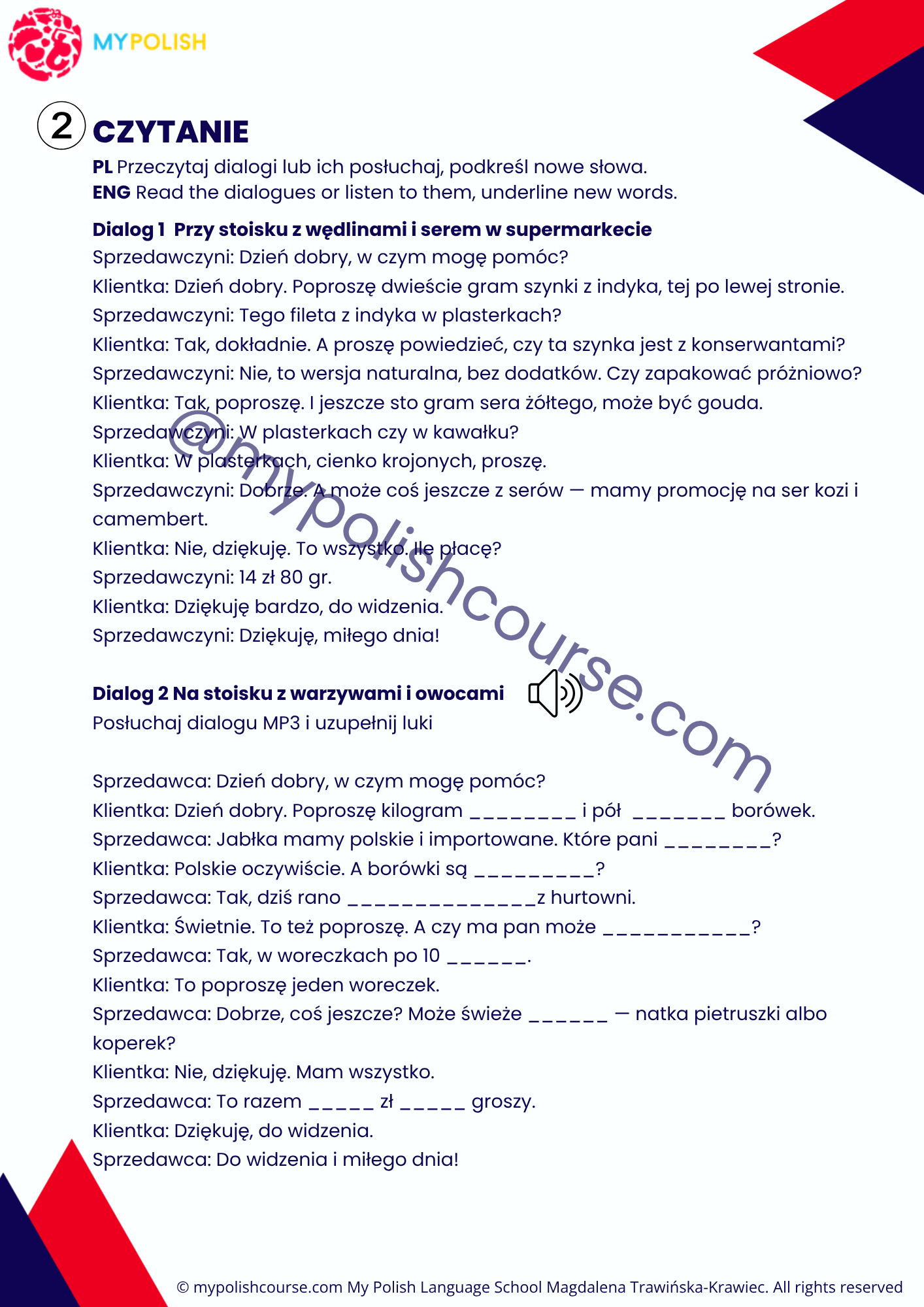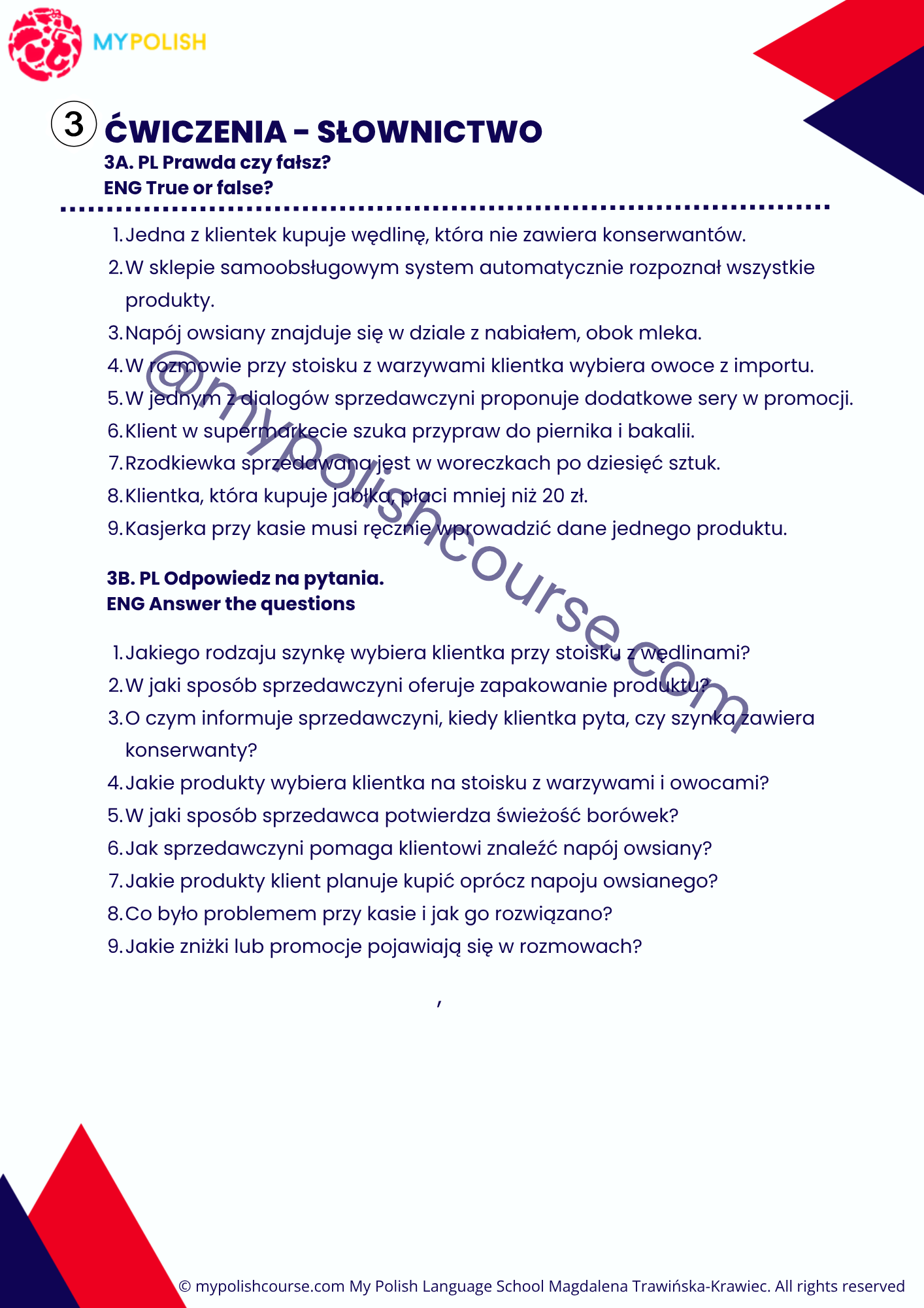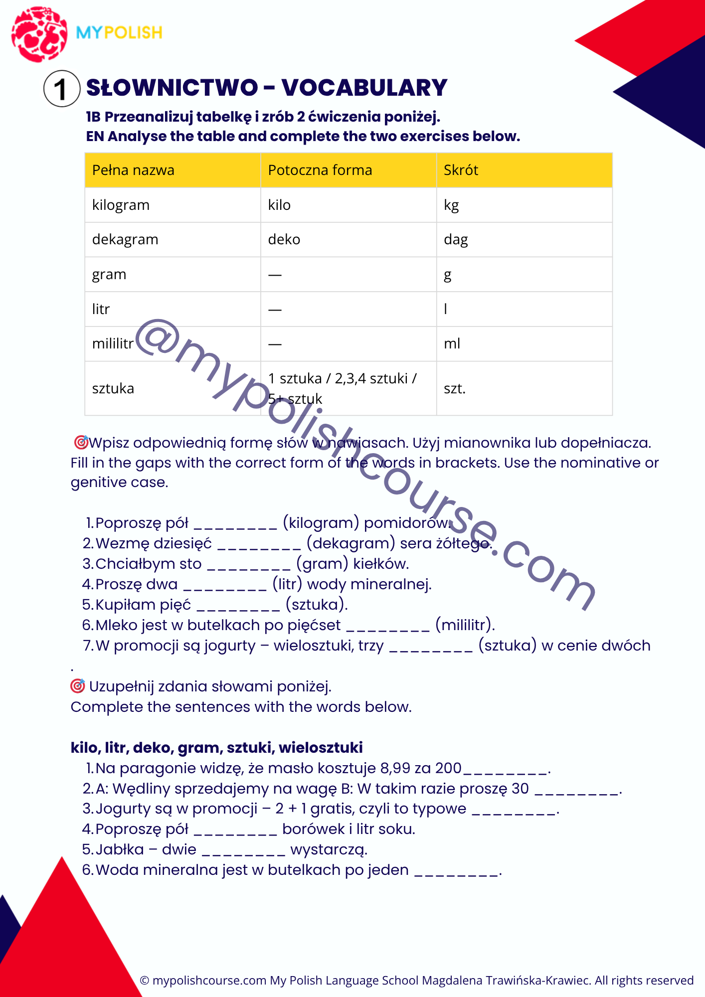 Doskonała propozycja dla osób, które szukają kart pracy do nauki naturalnego języka w różnych sytuacjach życiowych. Ta karta pracy z serii "Praktyczny polski" uczy bardziej zaawansowanych słów związanych z zakupami, np. dział, opakowanie lub sztuka. Zawiera naturalne dialogi wraz z dwoma nagraniami mp3, pytania do dialogów, naukę słownictwa związanego z zakupami, ale też z jednostkami masy (kilogram, dekagram, gram), ćwiczenia powtórkowe na dopełniacz (w liczbie pojedynczej i mnogiej) oraz ćwiczenia na mówienie. W karcie zawarta jest również transkrypcja nagrań oraz klucz odpowiedzi. To 15 stron kompleksowych ćwiczeń (słownictwo, czytanie, słuchanie, mówienie, pisanie) dla osób, które chcą poszerzyć słownictwo związane z życiem codziennym i uczyć (się) go w naturalnym kontekście.