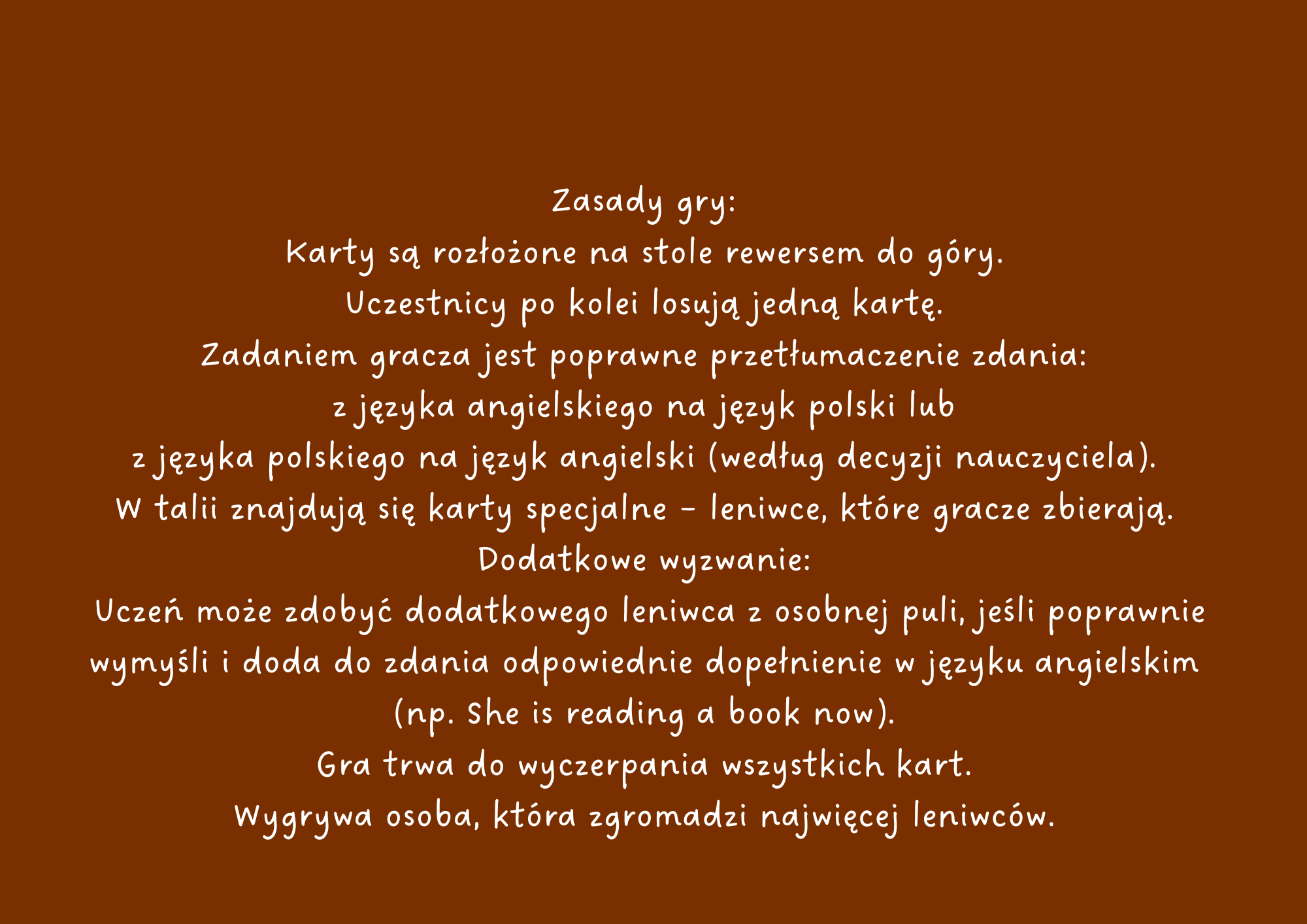 Uczeń może zdobyć dodatkowego leniwca z osobnej puli, jeśli poprawnie wymyśli i doda do zdania odpowiednie dopełnienie w języku angielskim (np. She is reading a book now).