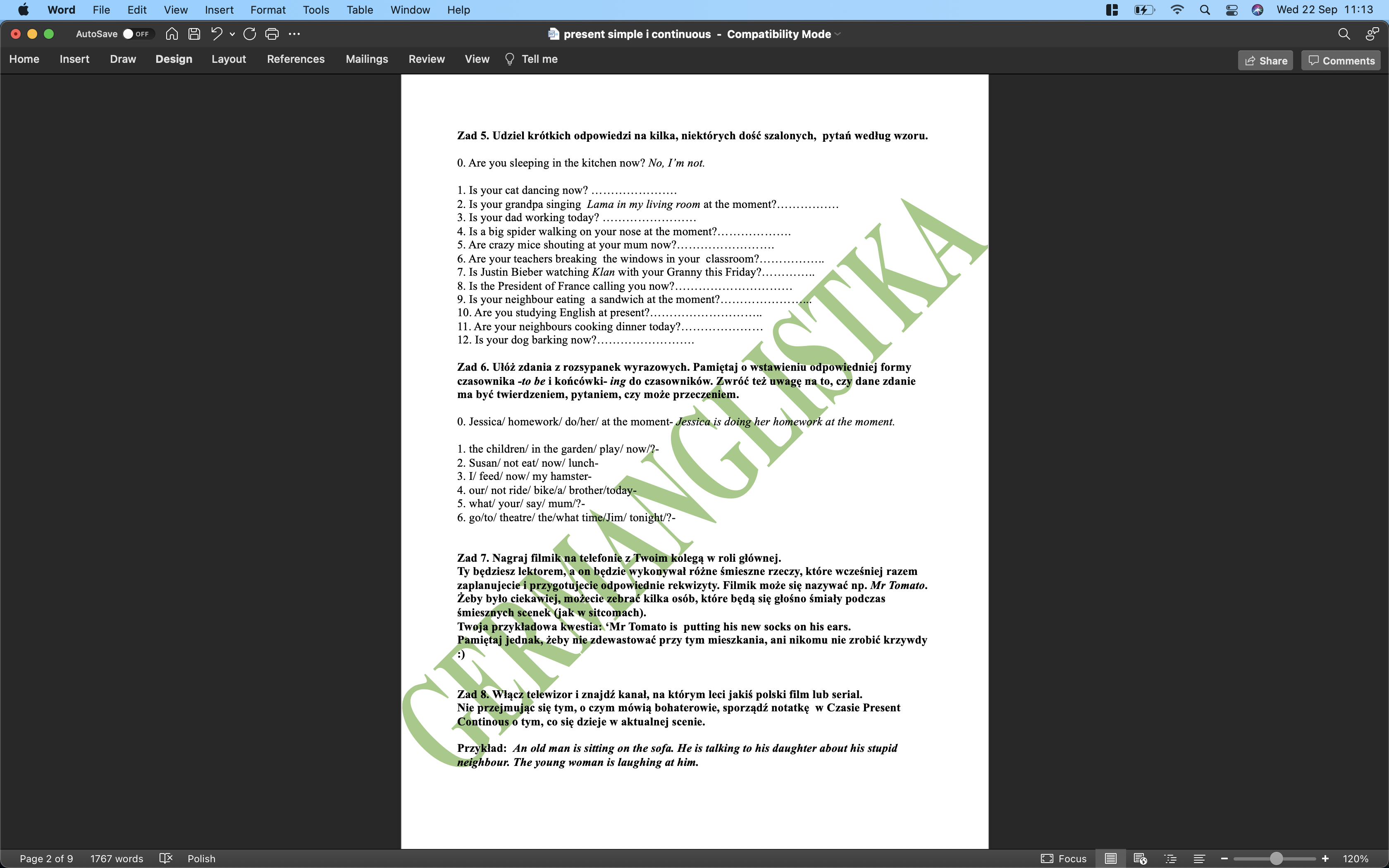 8 ćwiczeń z czasu Present Continuous+ KLUCZ 6 ćwiczeń z czasu Present Simple+ KLUCZ 4 ćwiczenia na rozróżnienie tych dwóch czasów+ KLUCZ