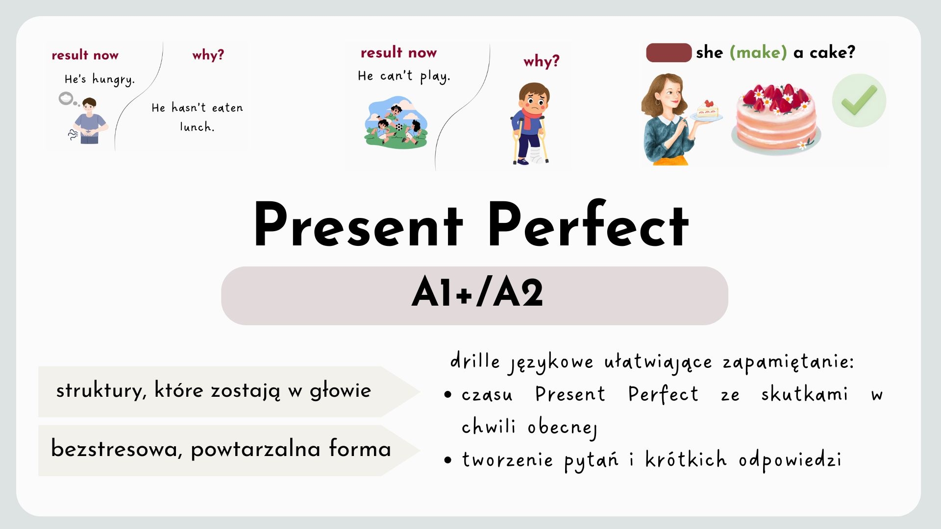 Ten zestaw to gotowe drille językowe i ćwiczenia do Present Perfect (A1–A2), które pomagają uczniom zrozumieć i zautomatyzować użycie czasu Present Perfect (skutki widoczne teraz)