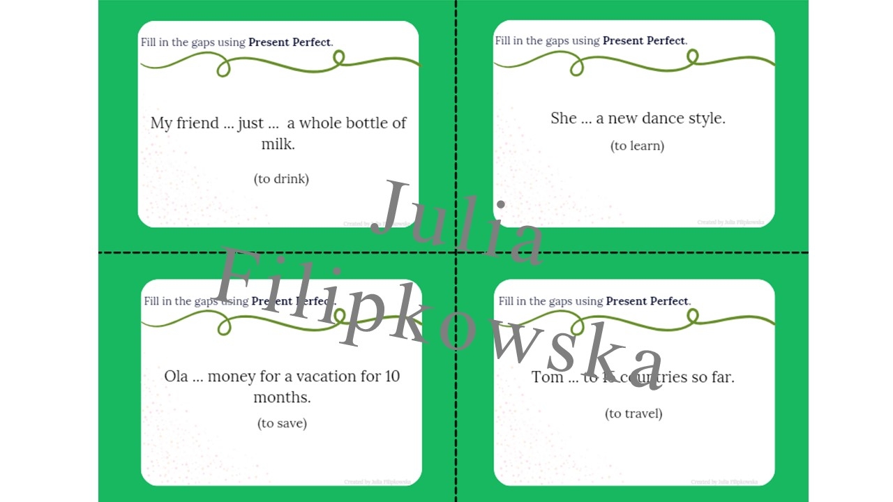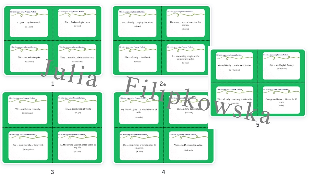 Zapraszam do zakupu materiału w języku angielskim: 20 kart do ćwiczenia Present Perfect w mowie (5 stron A4). Zadanie polega na uzupełnieniu zdania brakującym (podanym) czasownikiem używając Present Perfect. Materiał idealny na rozgrzewkę przypominającą gramatykę dla uczniów na początek zajęć, lub dla uczniów przygotowujących się do różnych egzaminów. Polecam karty wyciąć i zalaminować dzięki czemu wystarczą na wiele lat.