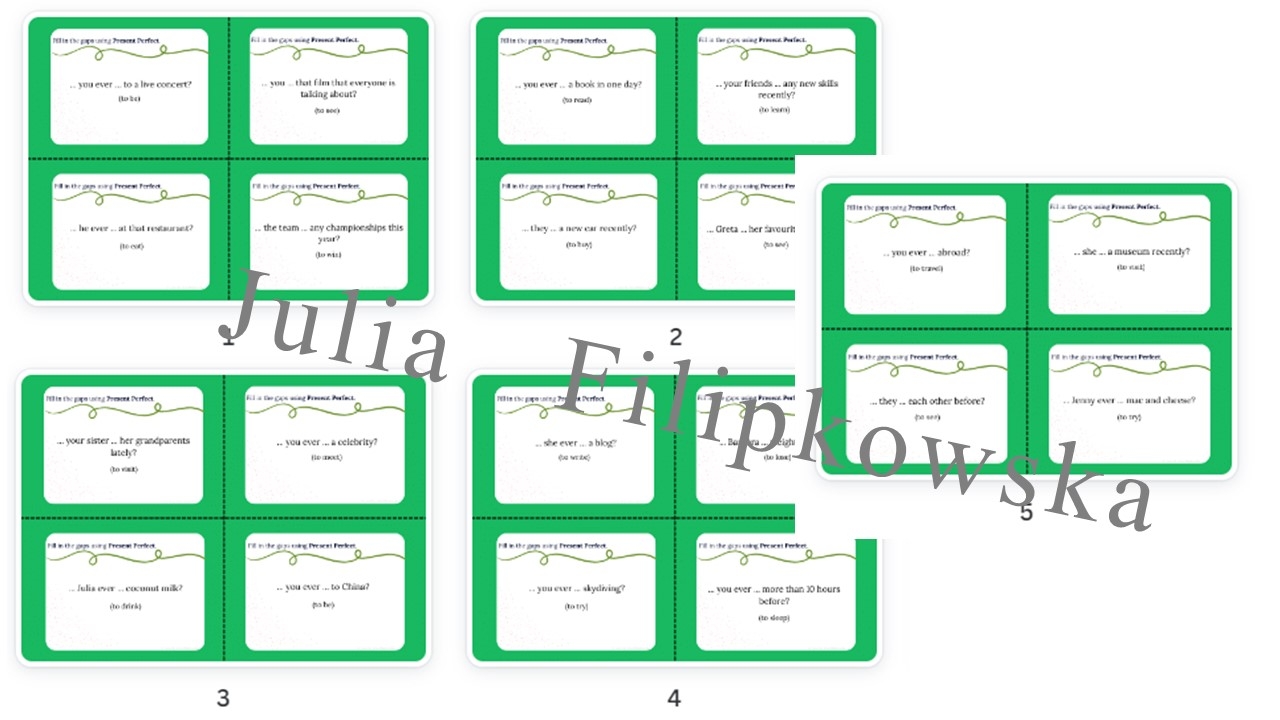 Zapraszam do zakupu materiału w języku angielskim: 20 kart do ćwiczenia Present Perfect w mowie (5 stron A4). Zadanie polega na uzupełnieniu zdania brakującym (podanym) czasownikiem używając Present Perfect. Materiał idealny na rozgrzewkę przypominającą gramatykę dla uczniów na początek zajęć, lub dla uczniów przygotowujących się do różnych egzaminów. Polecam karty wyciąć i zalaminować dzięki czemu wystarczą na wiele lat.