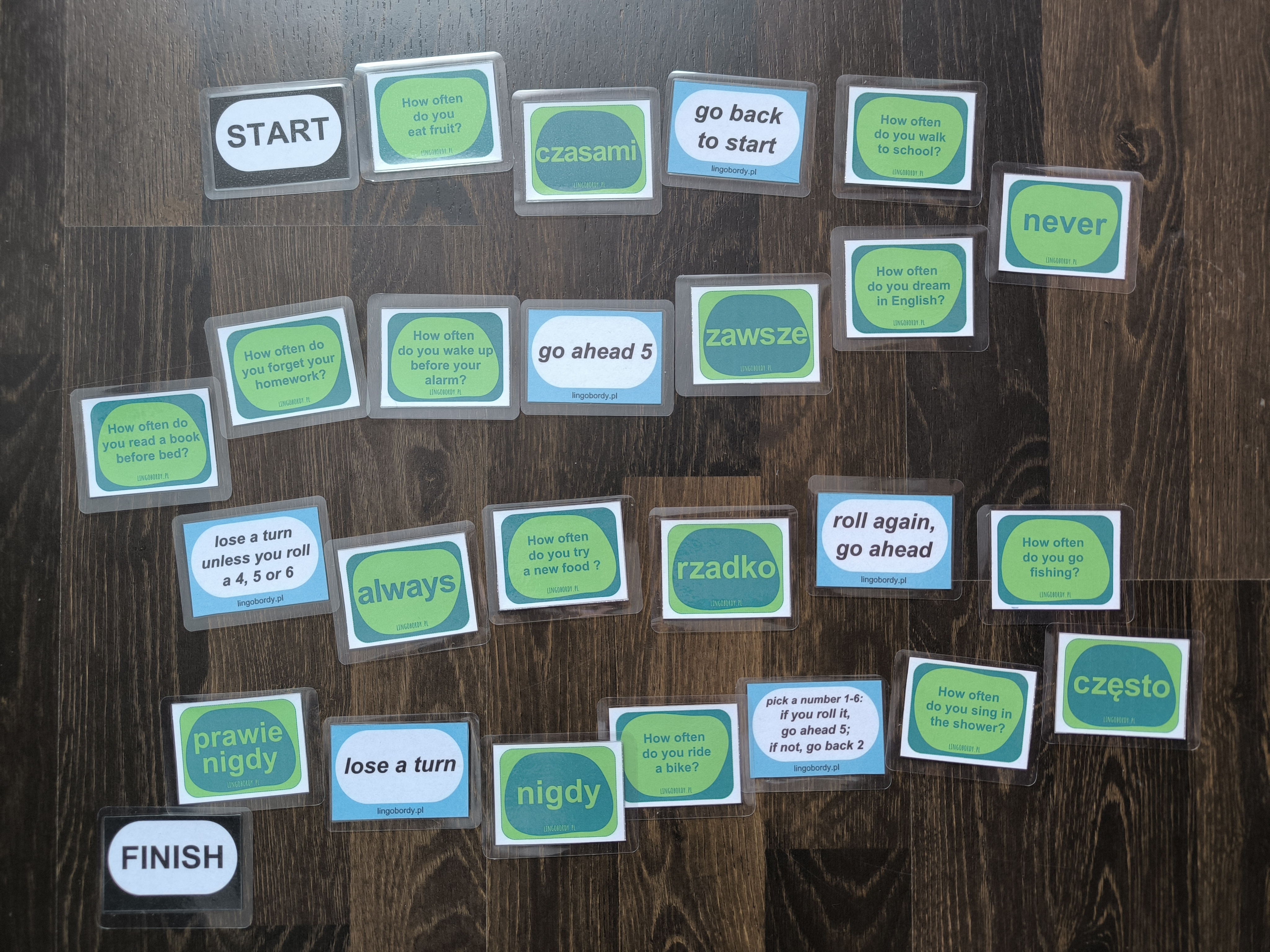- Wykorzystaj karty memory do stworzenia unikalnej gry planszowej. Rozłóż kafelki w losowej kolejności i dodaj kafelki START i FINISH oraz kafelki SPECJALNE. Użyj zestawu memory samodzielnie lub wymieszaj z kartami, na których znajdują się pytania 'How often'.