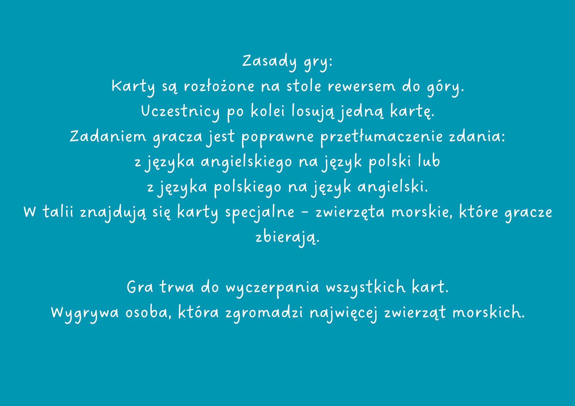 Gra dydaktyczna została stworzona z myślą o rozwijaniu umiejętności językowych uczniów w sposób aktywny i angażujący. Podczas rozgrywki uczniowie losują karty z zadaniami polegającymi na tłumaczeniu zdań z języka angielskiego na język polski lub z języka polskiego na język angielski. Dzięki temu ćwiczą słownictwo, gramatykę oraz poprawne budowanie zdań w naturalnym kontekście. Elementem motywującym są karty specjalne przedstawiające zwierzęta morskie, które uczniowie zbierają w trakcie gry. Wprowadza to element rywalizacji i zabawy, a jednocześnie zachęca do aktywnego udziału wszystkich uczestników. Gra trwa do momentu wykorzystania wszystkich kart, a zwycięzcą zostaje osoba, która zgromadzi najwięcej kart ze zwierzętami morskimi.