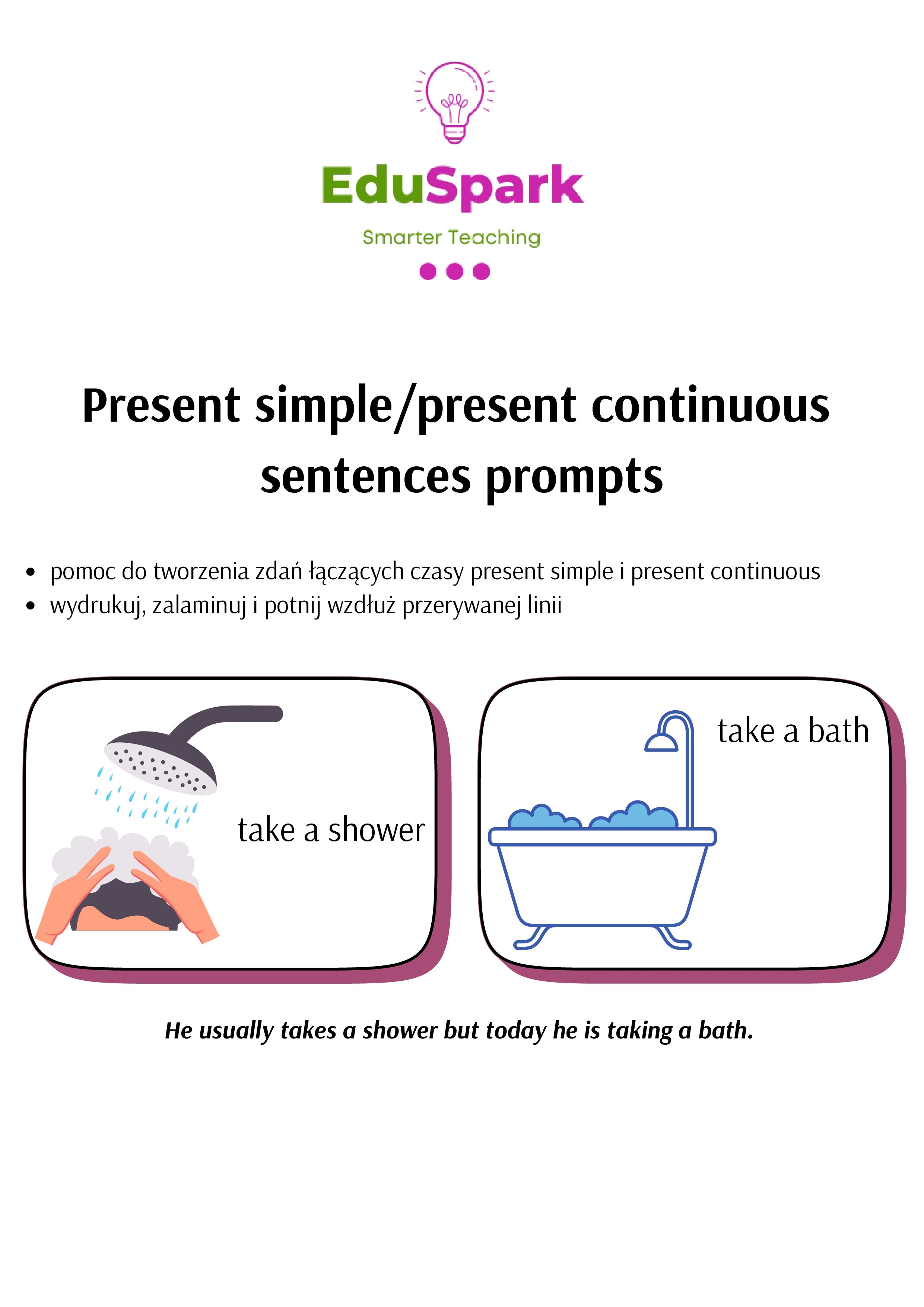 Zestaw 16 par obrazków do tworzenia zdań łączących czasy Present Simple i Present Continuous.