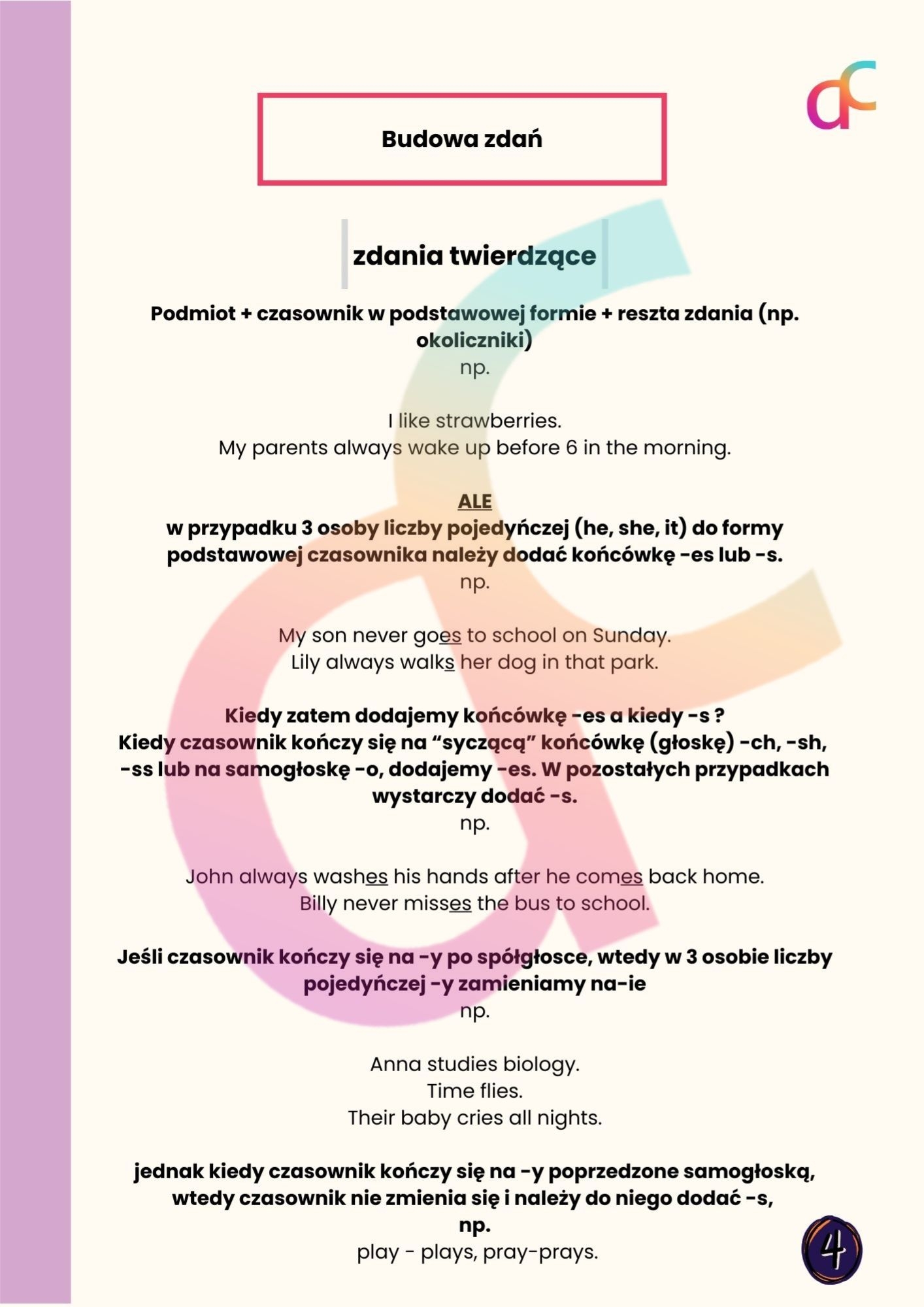 Zeszyt ćwiczeń wraz z kluczem odpowiedzi poprzedzony teorią zastosowania oraz tworzenia zdań twierdzących, przeczących oraz pytających, stosowania przyimków czasu, itd.