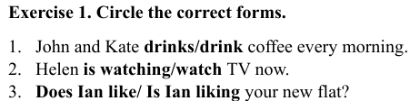Składa się z 4 zadań: zakreślenie odpowiedniego czasownika, wpisanie czasownika w odpowiedniej formie, przetłumaczenie zdań oraz przypisanie do tabeli do odpowiedniego czasu (simple / continuous) podanych key words (np. usually, at the moment).