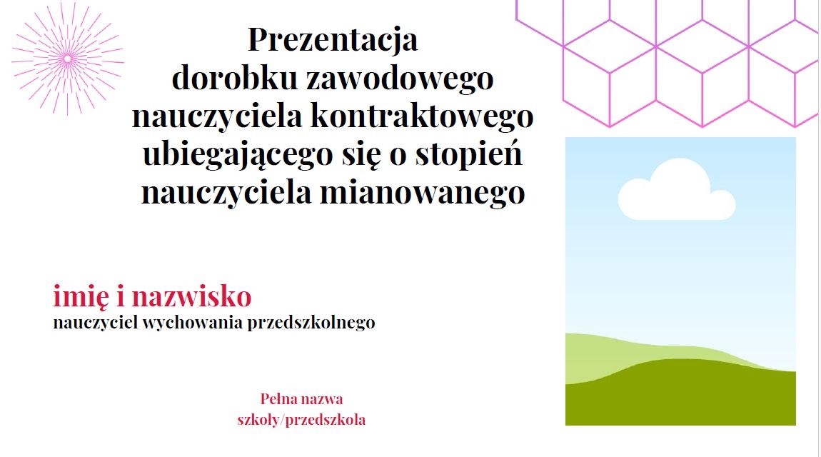 Prezentację robiłam pracując jako nauczyciel wychowania przedszkolnego, natomiast mogą z niej skorzystać również nauczyciele pracujący w klasach I-III, IV-VIII czy szkołach ponadgimnazjalnych, którzy ubiegają się o stopień nauczyciela mianowanego.