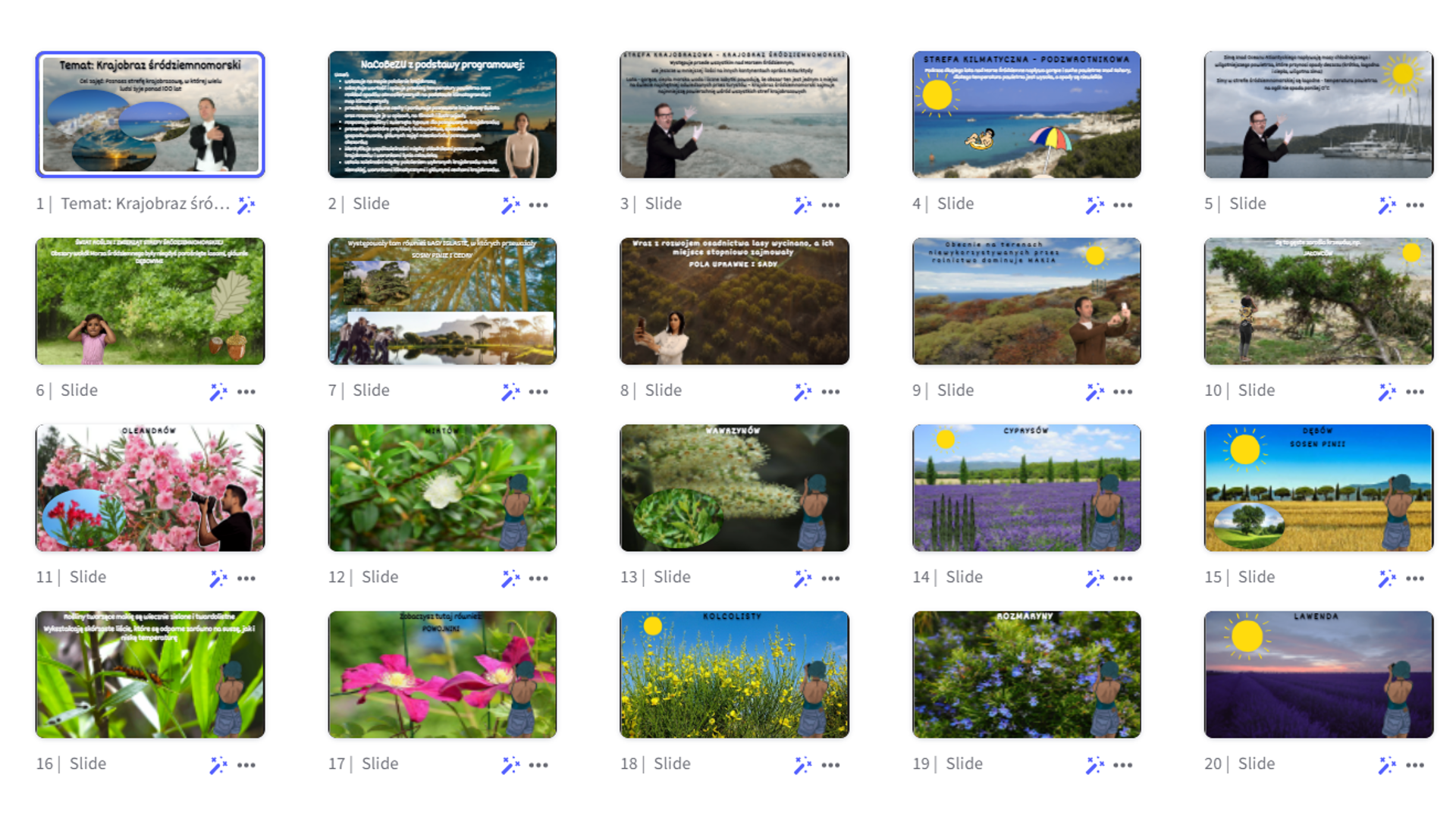 Prezentacja „Krajobraz śródziemnomorski” zawiera 51 slajdów z informacjami i grafiką – należy uzupełnić ją o mapy i klimatogramy z podręcznika – w darmowych aplikacjach takich się nie znajdzie. Obrazy są w większości ruchome – gify. Grafika w całości pochodzi z Pixabay.com, freepic.com, moich autorskich oraz z dostępnych na genial.ly gifów. Należy pobrać przez reuse this genially – koniecznie:)