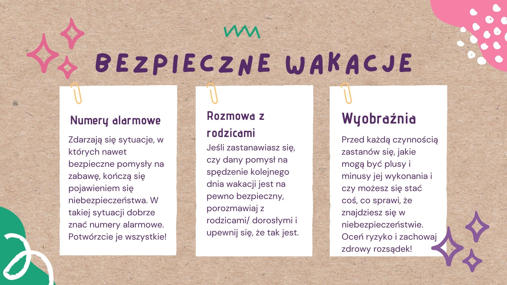 Przygotowana gazetka / prezentacja to zestaw 14 slajdów, dzięki którym możesz omówić wraz z klasą niebezpieczeństwa, które mogą pojawić się podczas wakacji, a także przygotować zbiór zasad bezpiecznych wakacji.