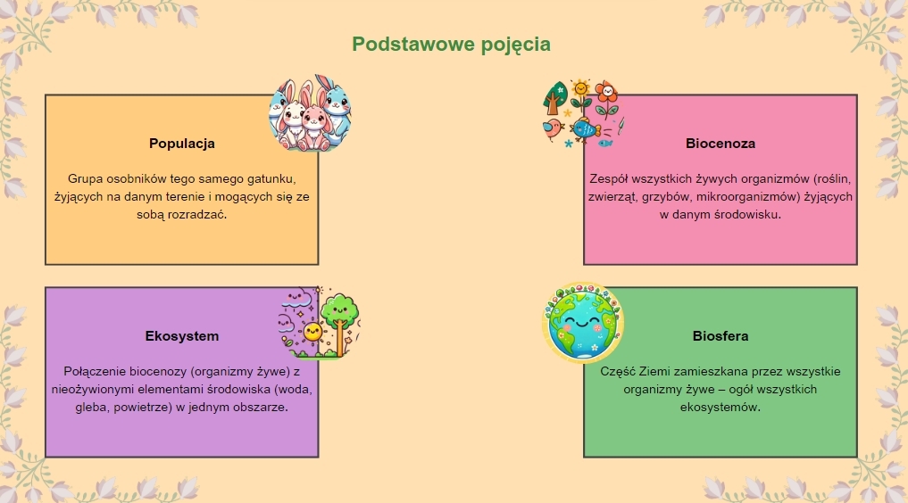 - Każda strona to inny temat: definicja ekologii, podstawowe pojęcia (populacja, biocenoza, ekosystem, biosfera), łańcuch pokarmowy, obieg węgla, eutrofizacja, wpływ człowieka na środowisko, sposoby ochrony przyrody, quiz, a na końcu podsumowanie i dyskusja.