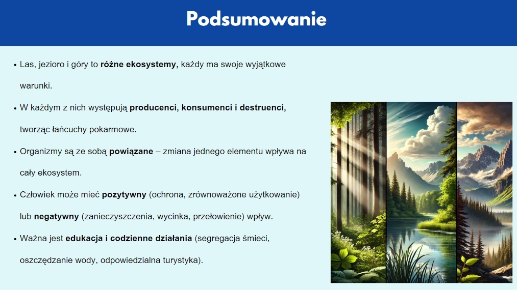 - Obejmuje trzy ekosystemy: las, jezioro i góry – każdy z nich omówiony szczegółowo pod kątem warunków środowiskowych, roślinności, zwierząt oraz zależności pokarmowych.