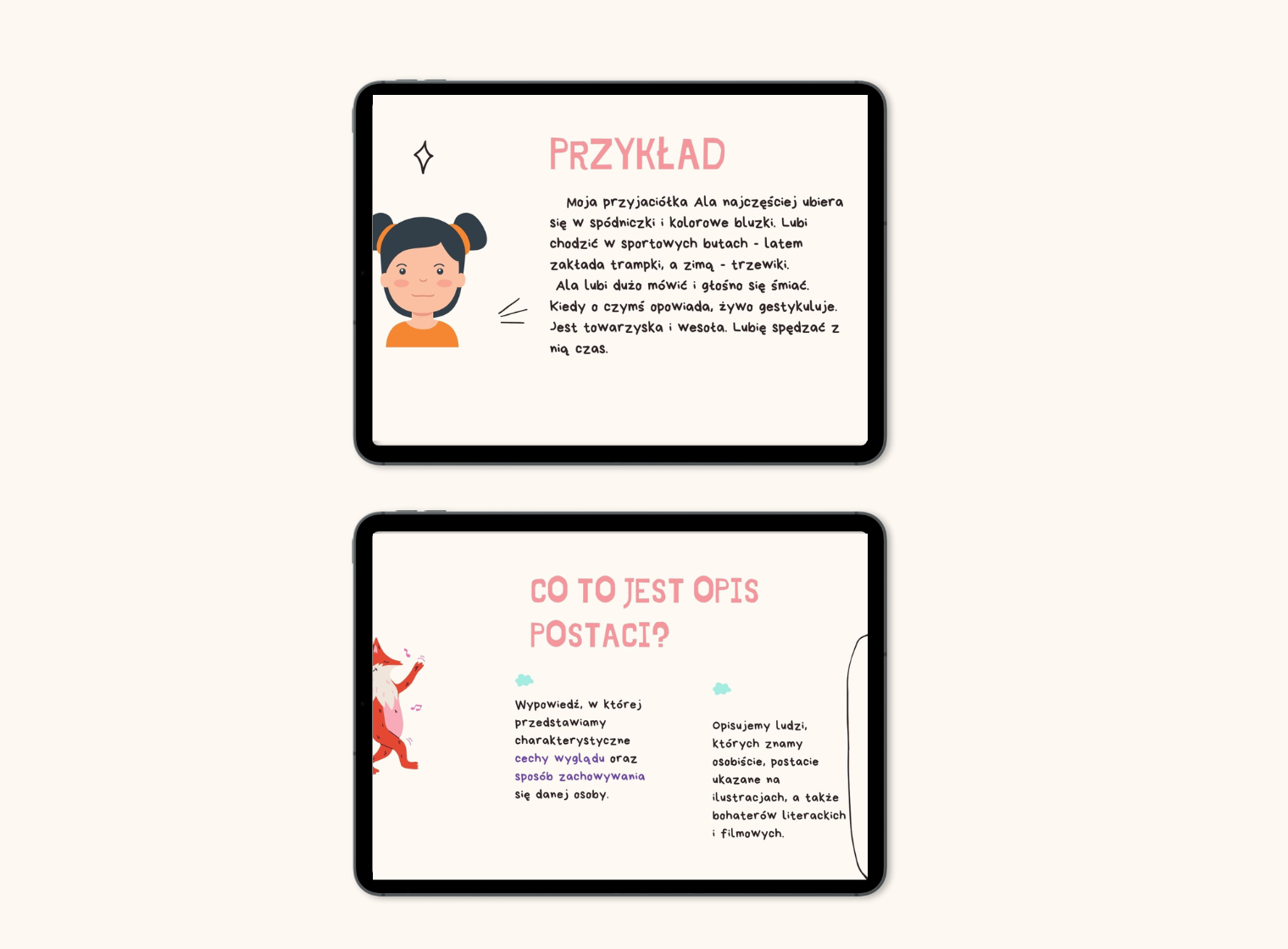 Prezentacja dla klas szkół podstawowych, w szczególności klasy czwartej. Przejrzysta, ale atrakcyjna forma. Materiał pomocny przy wprowadzaniu formy wypowiedzi - opis postaci. Zawiera następujące części: 1. Co to jest opis postaci? (krótka definicja) 2. Jak opisać postać? (instrukcja) 3. Przydatne słowa. 4. Przykład. W pliku zip. załączono formaty: pdf, mp4, pptx.