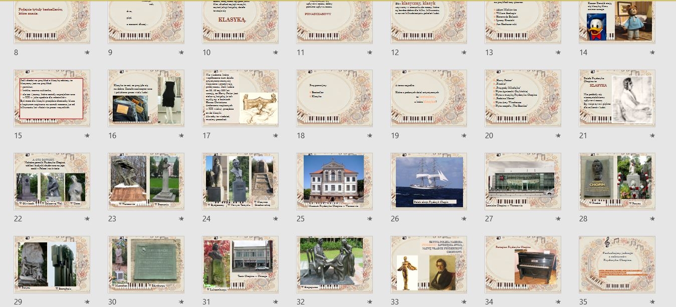 Dość długa prezentacja. Jej celem nie jest przedstawienie życiorysu czy twórczości Chopina, lecz próba przekonania uczniów, że kompozytor jest ważny i wart zainteresowania. Wyjaśnione są np. pojęcia bestseller i klasyka. Do slajdów dodane są krótkie wskazówki dla nauczycielki.