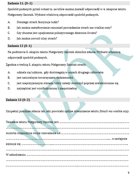 Arkusz ma na celu zapoznanie uczniów klas 6-7 lub 8 ze specyfiką zadań egzaminacyjnych, brzmieniem poleceń, strukturą zadań, punktacją i kryteriami oceniania. Pozwoli zdiagnozować uczniowskie strategie gospodarowania czasem, wychwycić najczęściej pojawiające się wątpliwości i zaplanować dalszą pracę przygotowującą do egzaminu. Od innych arkuszy tego typu prezentowany różni się tym, że ze względu na dobór sprawdzanego materiału może być zastosowany już w klasie szóstej.