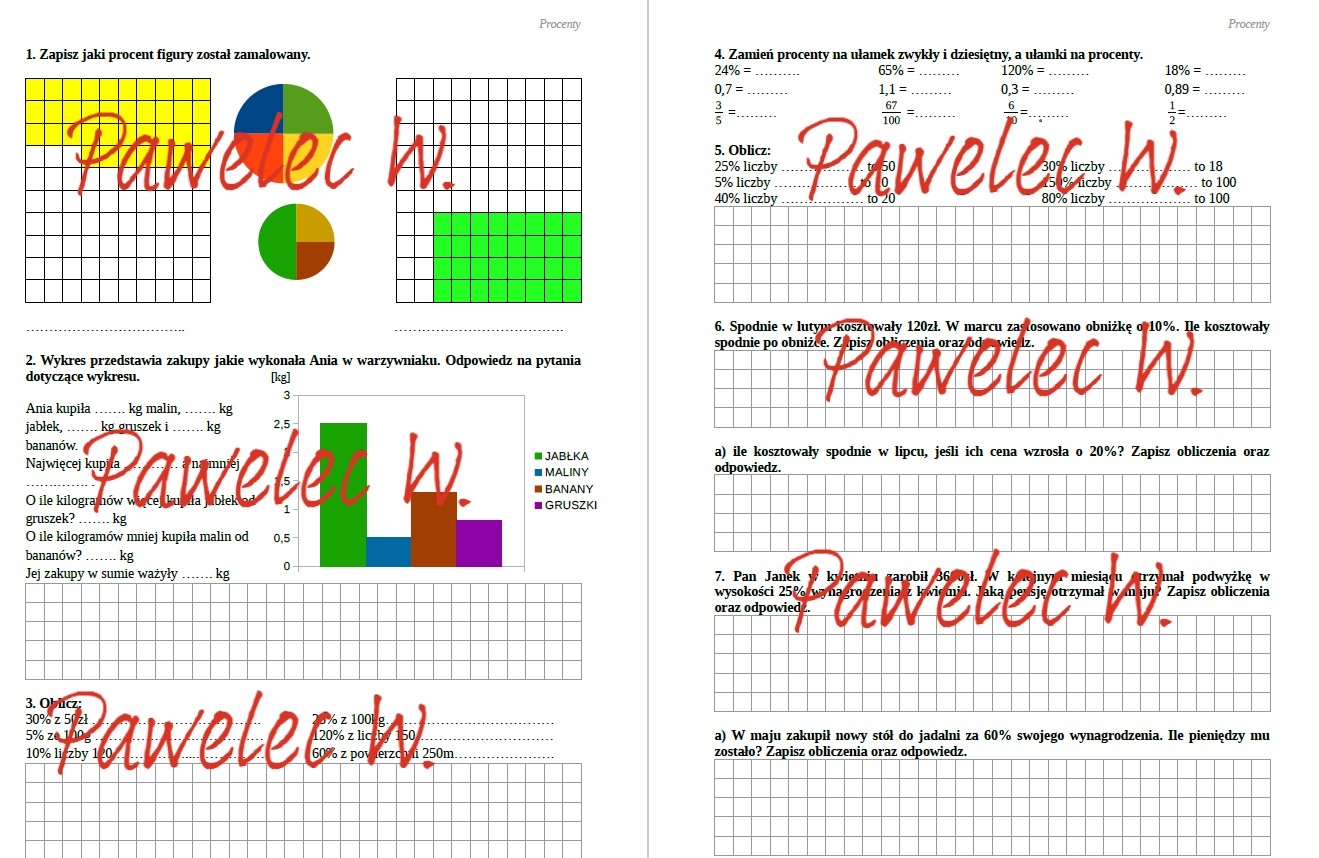 Karty pracy do ćwiczeń z działu procenty w klasie 6.