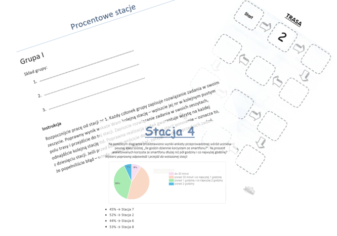 Materiał zawiera 10 stacji zadaniowych z działu "Procenty" dedykowanych dla uczniów klasy szóstej. Do materiału dołączono instrukcje z podziałem na sześć grup oraz prawidłową kolejność odwiedzania poszczególnych stacji.
