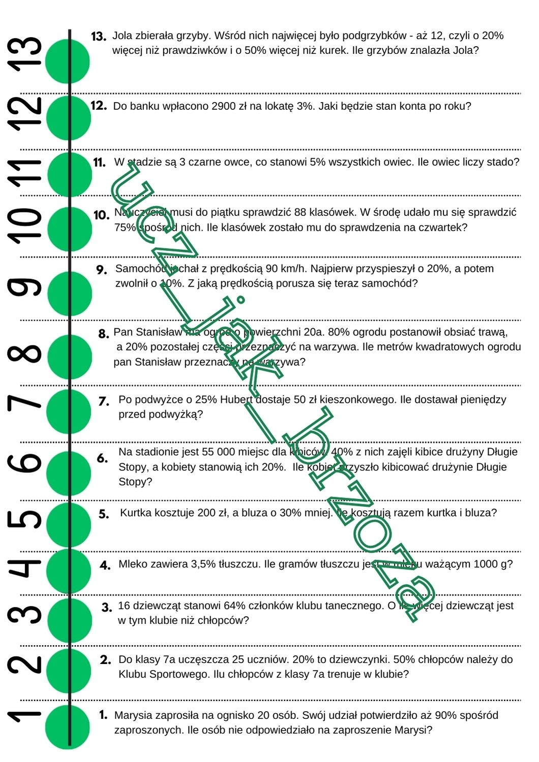 Sztafeta zadaniowa „Procenty” składa się z 13 zadań dotyczących tematu.