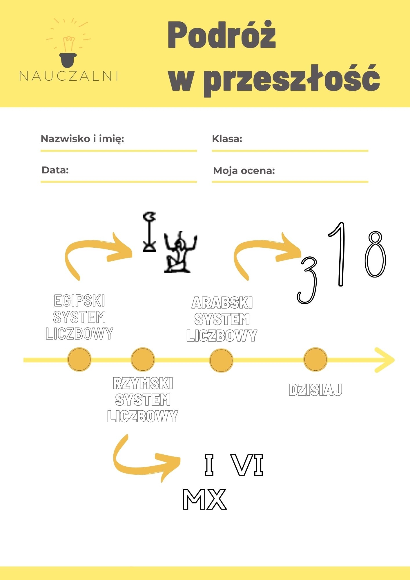 Plik jest projektem "Podróż w przeszłość". Można wykorzystać go jako podsumowanie tematów z zakresu systemów liczbowych, zegara, kalendarza i zapisywania i porównywania liczb. Kwintesencją będzie podróż w przeszłość, czyli zapisywanie liczb w systemie rzymskim i rzymskim.