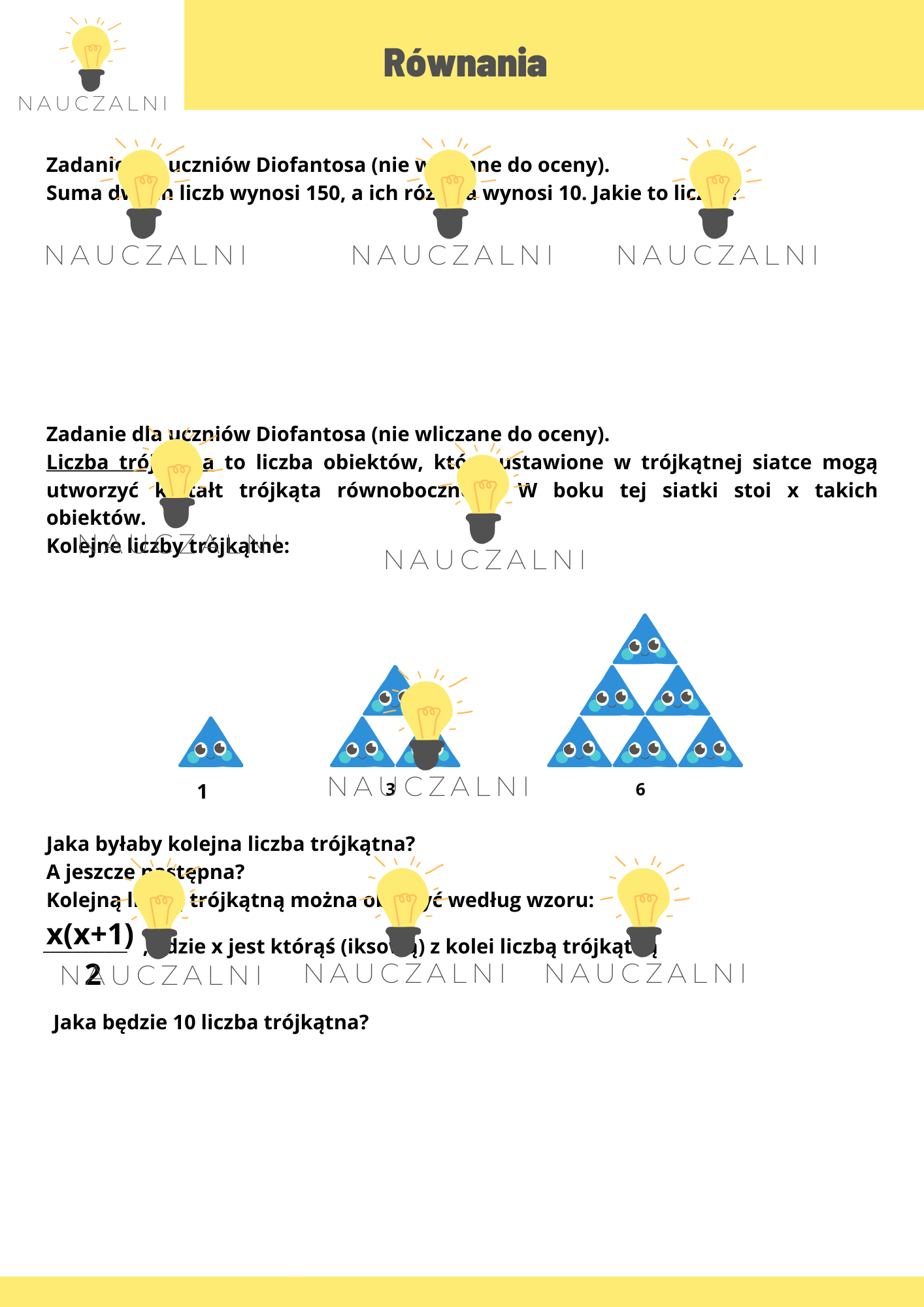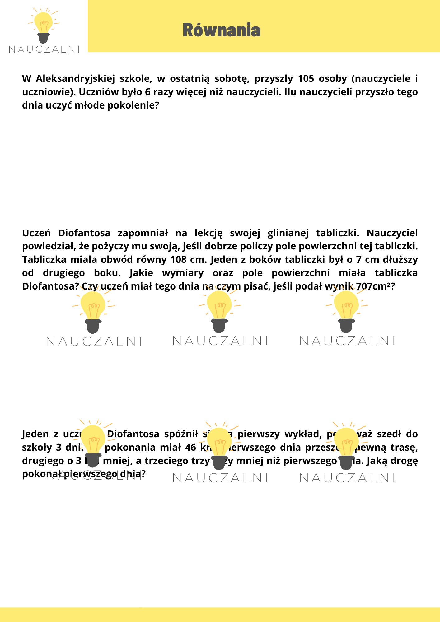 Projekt Uczniowie Diofantosa to karta pracy przybliżająca uczniom klas 6 postać Diofantosa, ojca algebry. Pierwsza strona zawiera krótki opis tego, skąd w ogóle wiemy cokolwiek o równaniach. Kolejne dwie strony zawierają w sumie 5 zadań (zadania z treścią, zapisywanie, rozwiązywanie i sprawdzanie rozwiązań równań). Dalej, dla chętnych uczniów znajdują się zadania dla chętnych. Zadania oparte na równaniach, które rozwiązywał sam Diofantos, dopasowane do poziomu uczniów.