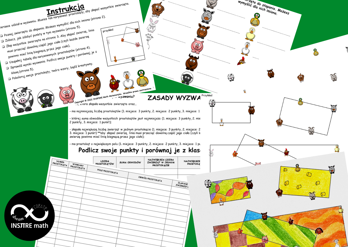 Uczniowie wezmą udział w wyzwaniu. Muszą tak narysować prostokąty, aby złapać wszystkie zwierzęta oraz obliczyć pola i obwody, aby zdobyć punkty. Zadanie nie jest tak proste, jak może się wydawać... Zasady wyzwania zmuszają do kombinowania:)