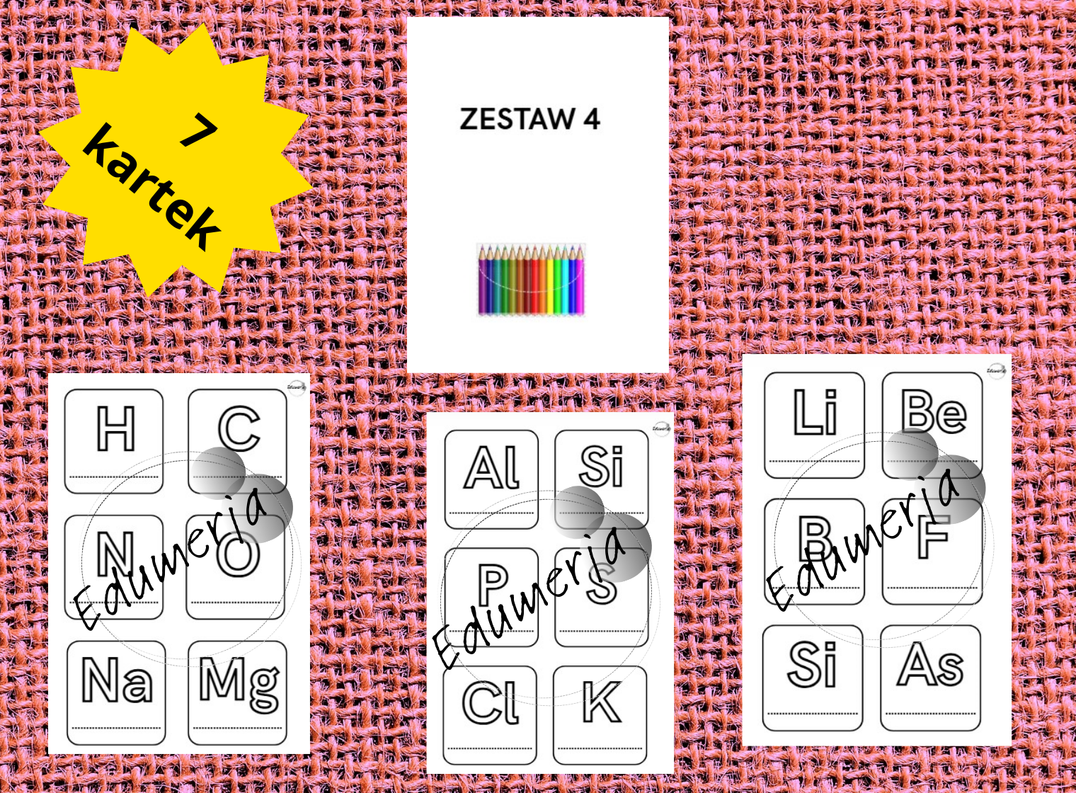 🎁 4 zestawy kart z symbolami pierwiastków do KOLOROWANIA