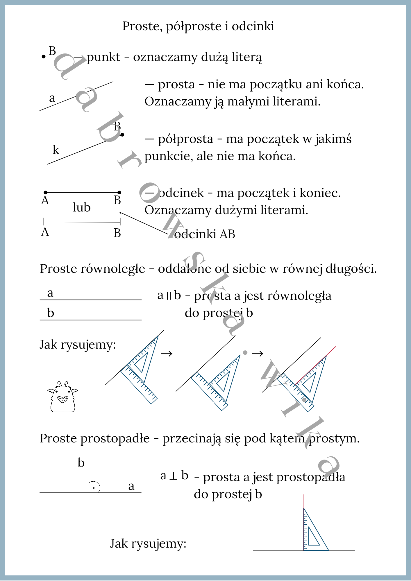 W notatce znajdują się wyjaśnione pojęcia tych poszczególnych elementów, a także informacje o prostych równoległych i prostopadłych wraz z instrukcją ich rysowania.