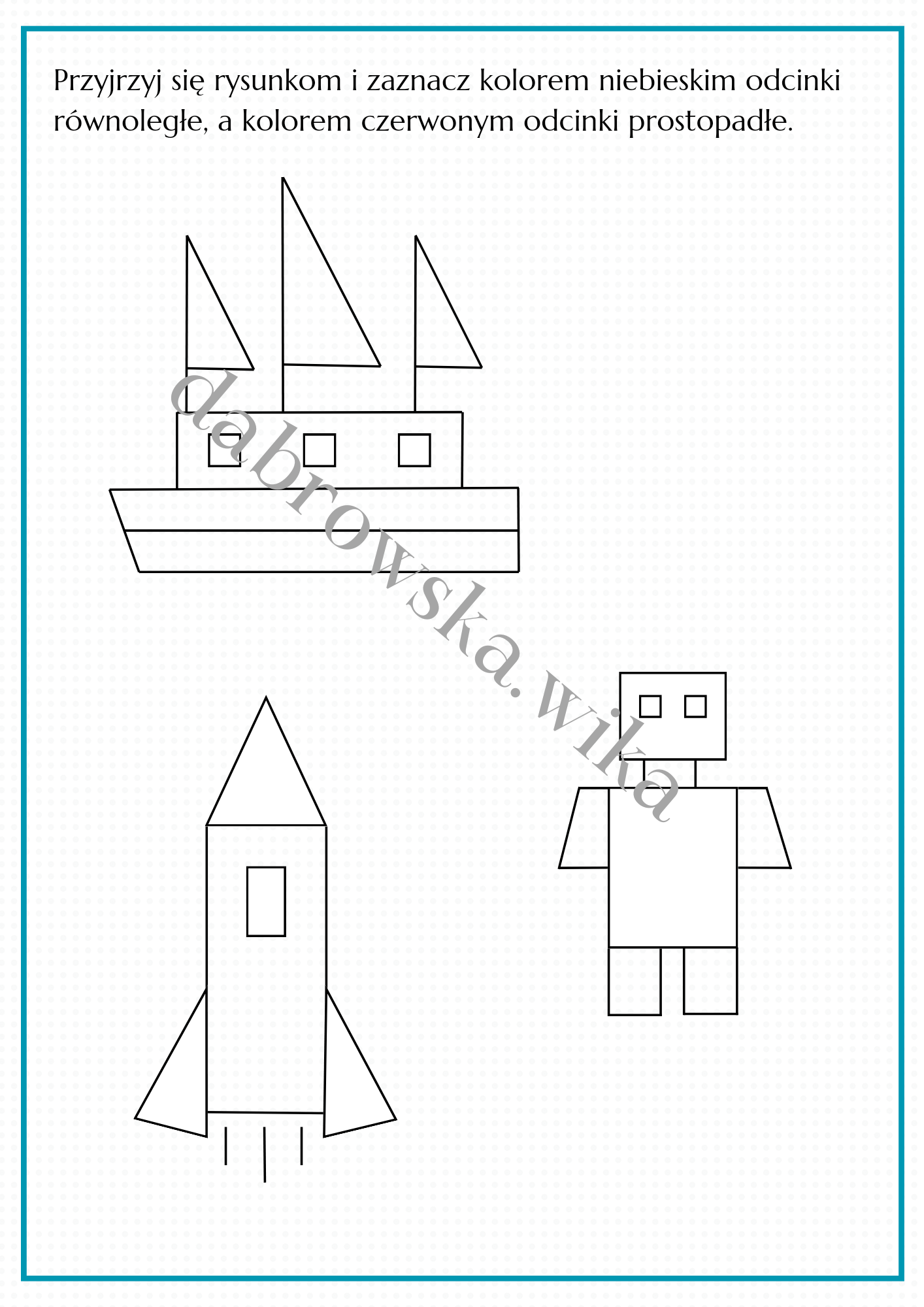 Materiał zawiera zadanie polegające na odszukaniu na trzech obrazach jak najwięcej prostych prostopadłych i równoległych i zaznaczeniu ich na odpowiedni kolor.