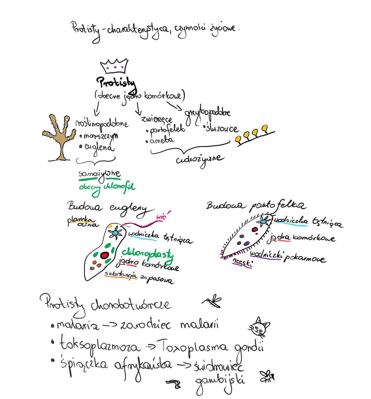 Notatka w kolorowej formie zawierająca najważniejsze informacje dotyczące protistów.